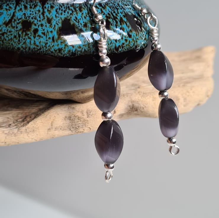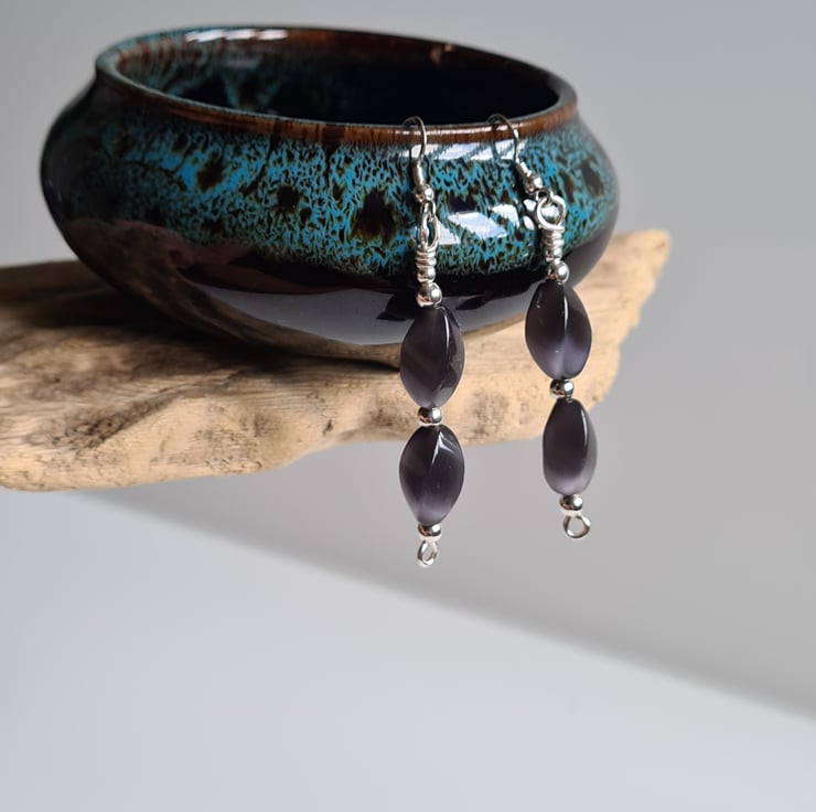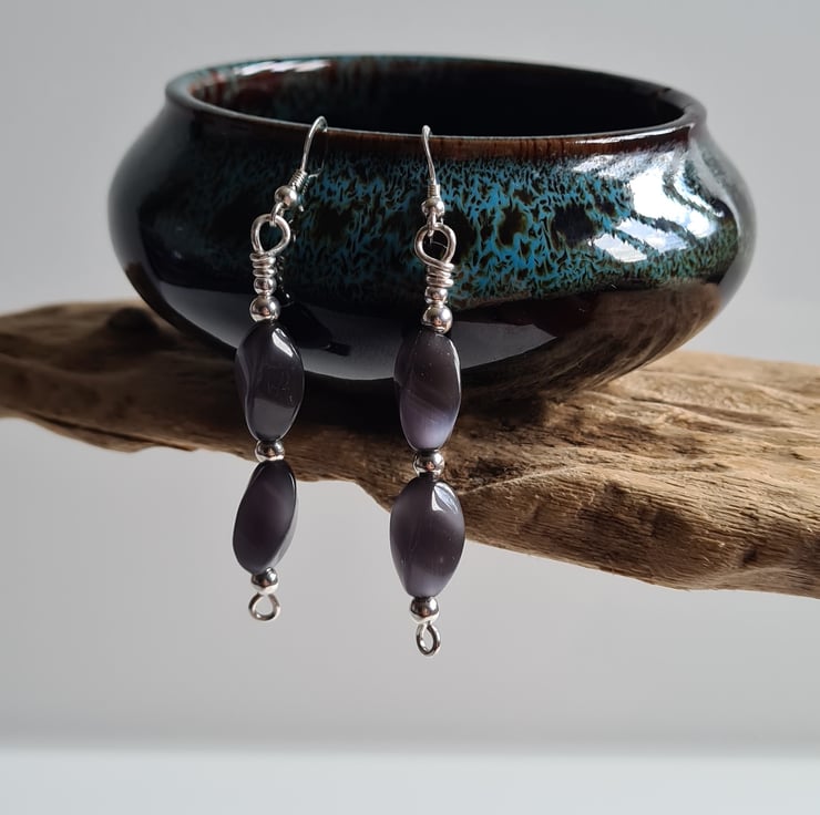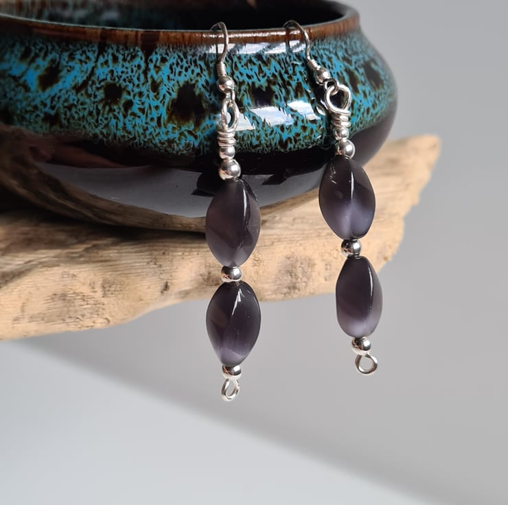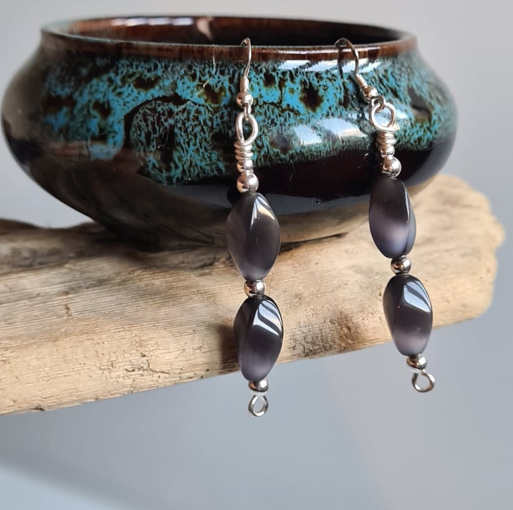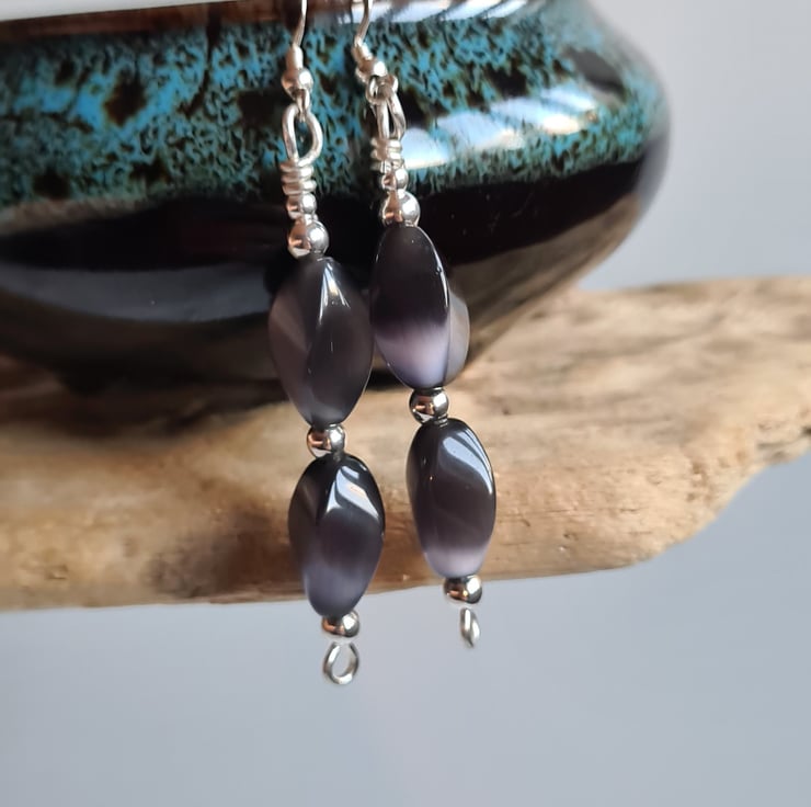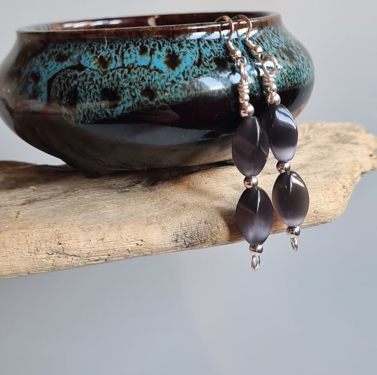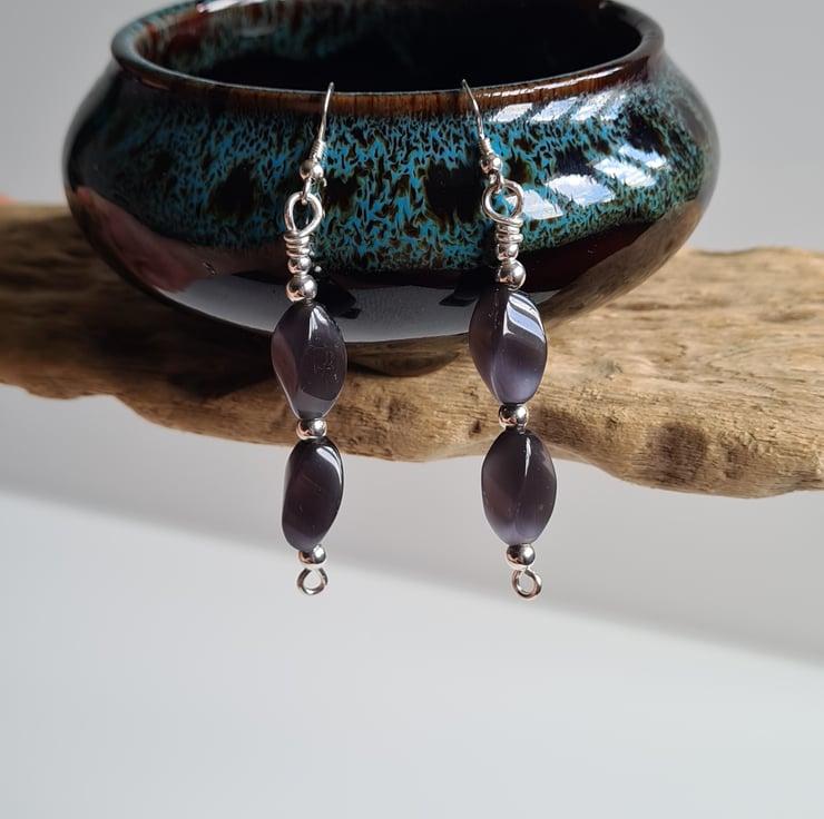 I have taken these stylish shimmering Grey Cats Eye style beads and strung them on 925 Silver Earrings with cute 925 Silver beads to finish them off.