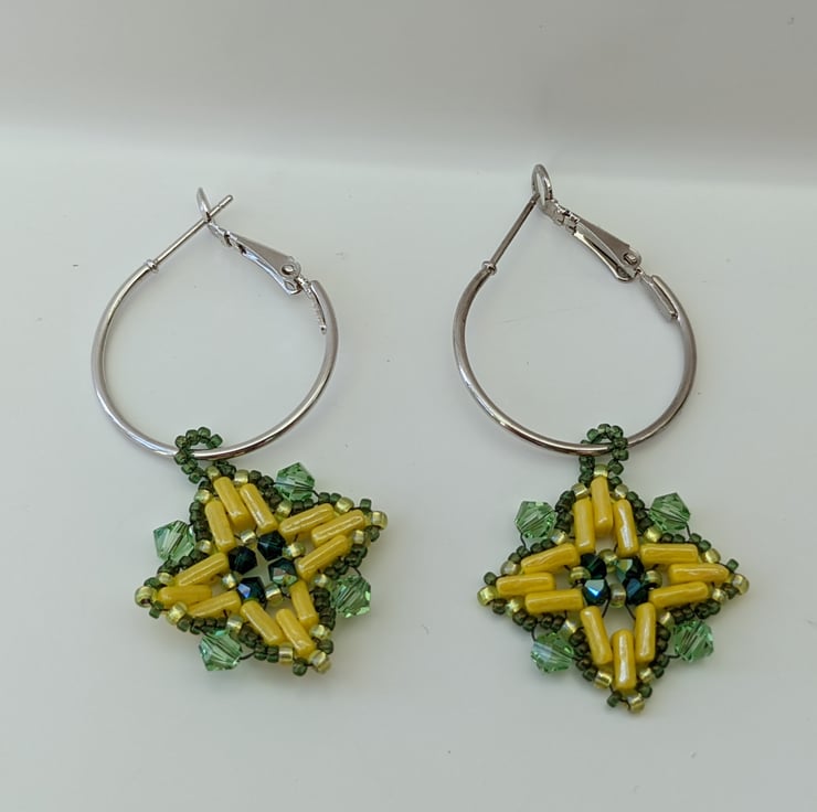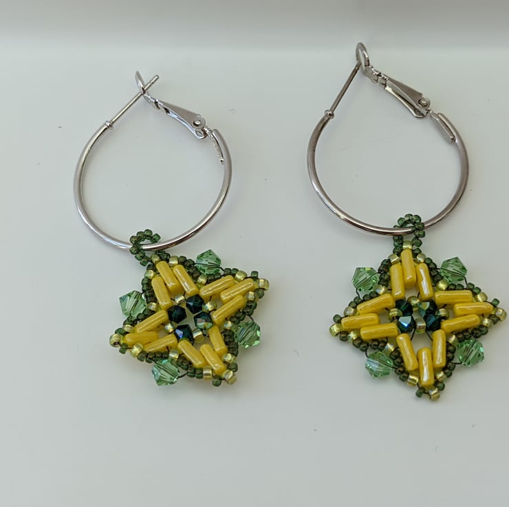 Yellow and green motif charm seed beaded earrings with green crystals, unique design beaded charm with beautiful crystals 5cm drop motif can be slid off. Will come gift packaged