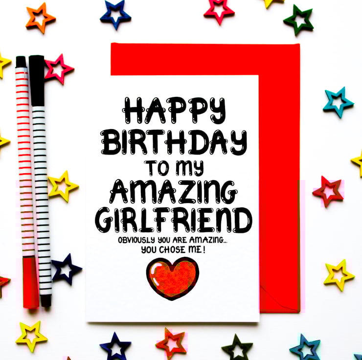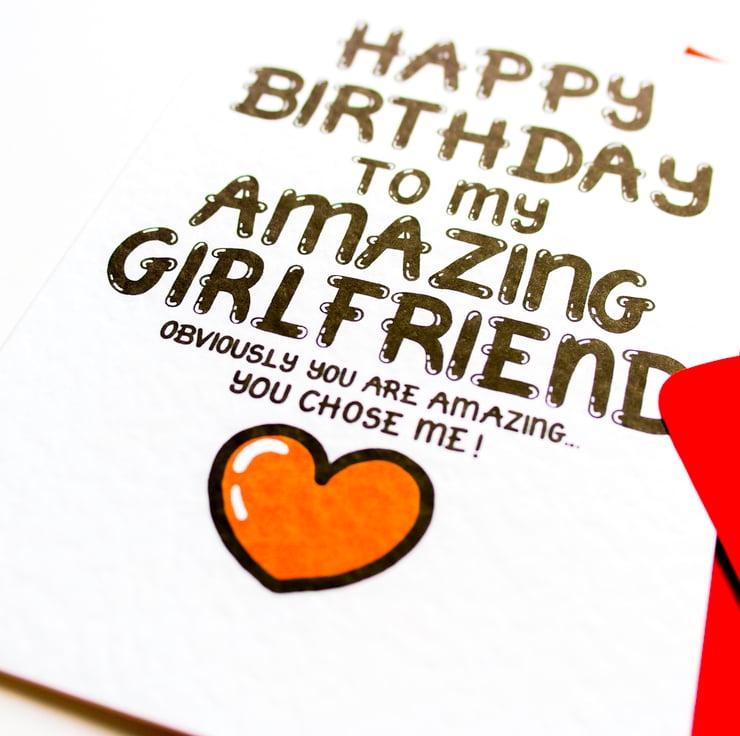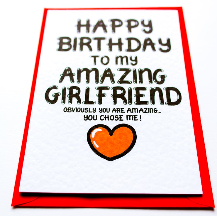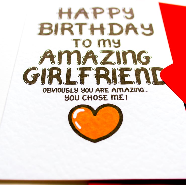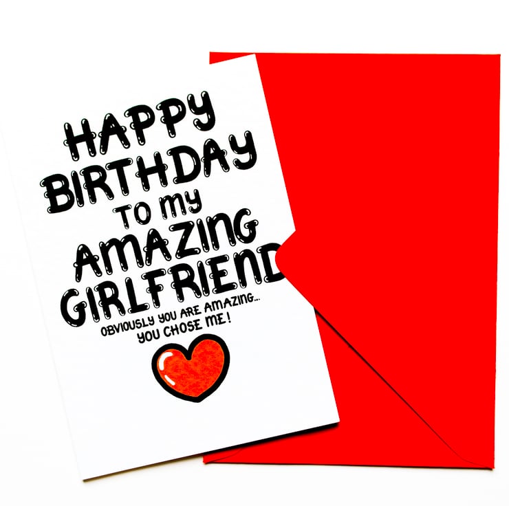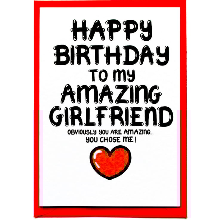 Greeting on front: HAPPY BIRTHDAY TO MY AMAZING GIRLFRIEND OBVIOUSLY YOU ARE AMAZING... YOU CHOSE ME!