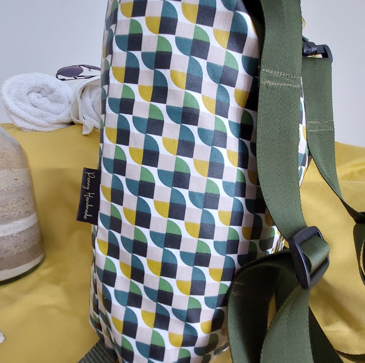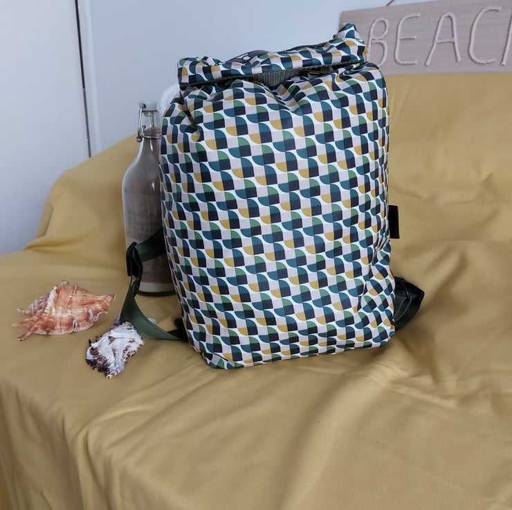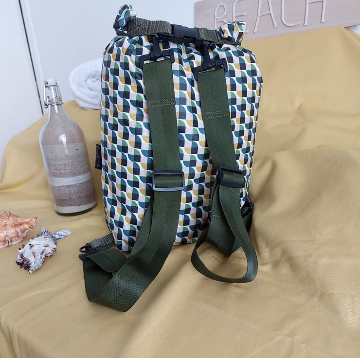 Drybag rucksack, measuring 47cm length x 36cm in width. Depth of boxed corners are 13 cm. Drybag has a rubberised waterproof lining with a handle inside for hanging out to dry. Outer fabric is a wipe cleancoated cotton. Rucksack straps are removable. Item has a rolltop using webbing and is secured with a clip fastening.