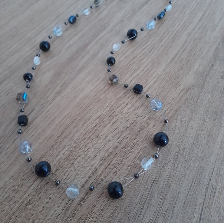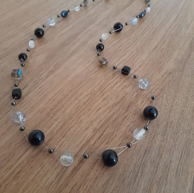 THIS ONE OF A KIND UNIQUE LONG NECKLACE HAS BEEN DESIGNED AND HANDMADE BY MYSELF USING A SELECTION OF BLACK GLASS BEADS IN VARIOUS SHAPES AND SIZES ALONG WITH CLEAR CRYSTAL BEADS IN VARIOUS SHAPES AND SIZES AND FINISHED WITH SILVER PLATED WIRE TWISTED WITHIN THE BEADS. THE NECKLACE SLIPS OVER HEAD NO CLASP, EASY TO WEAR.