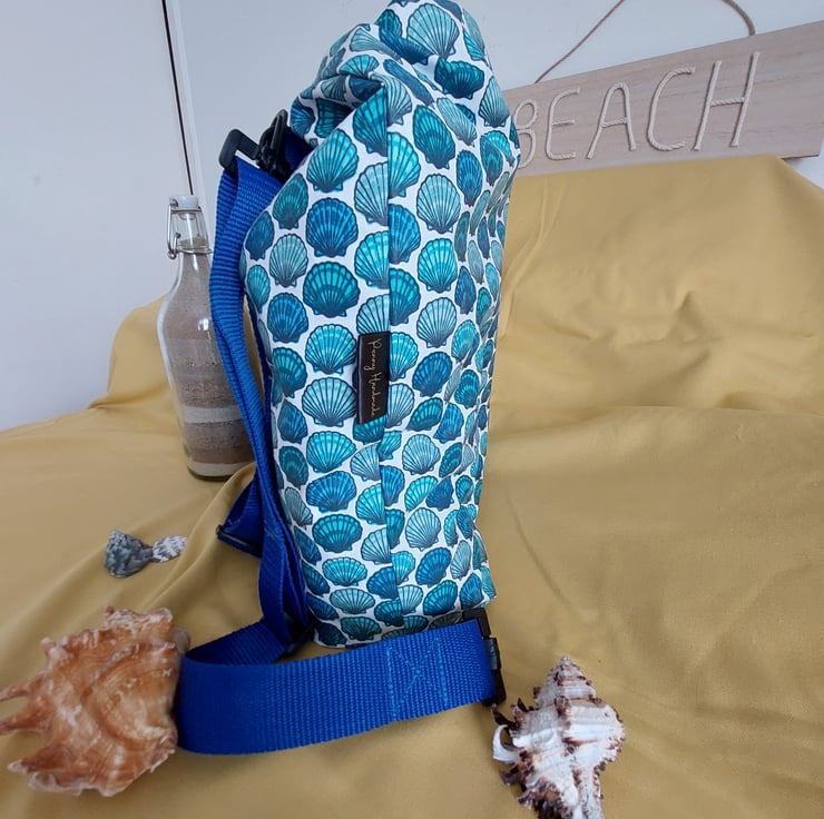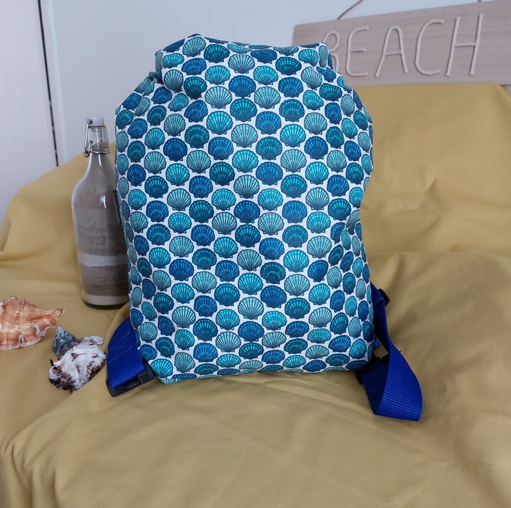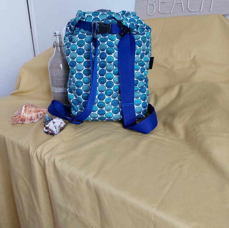 Drybag rucksack, measuring 49cm length x 37cm in width. Depth of boxed corners are 13 cm. Drybag has a rubberised waterproof lining with a handle inside for hanging out to dry. Outer fabric is a wipe cleancoated cotton. Rucksack straps are removable. Item has a rolltop using webbing and is secured with a clip fastening.