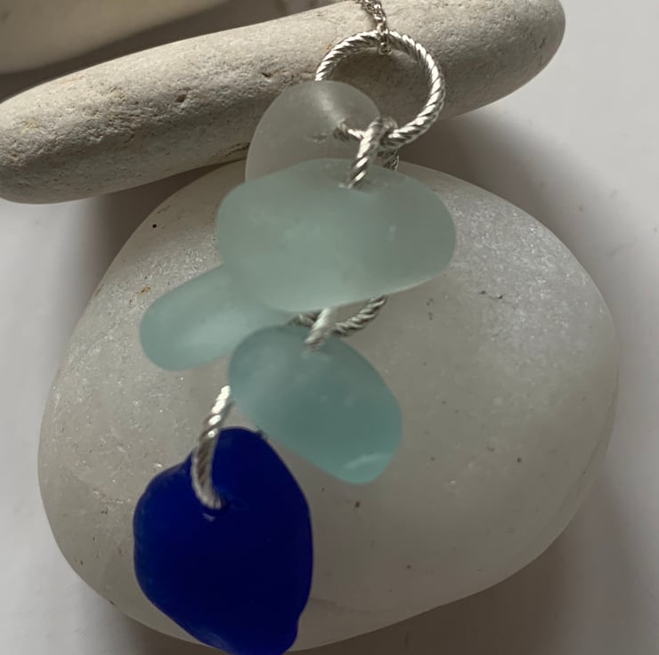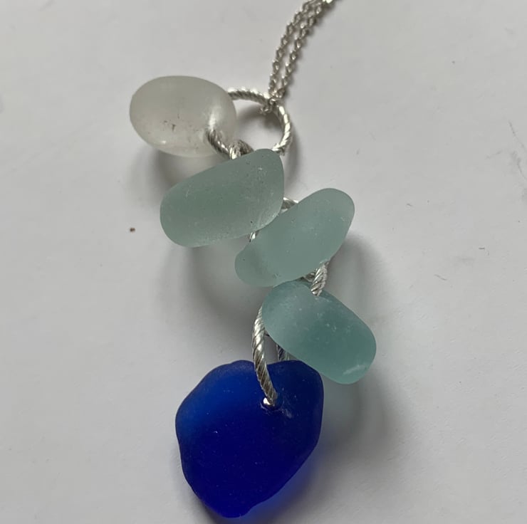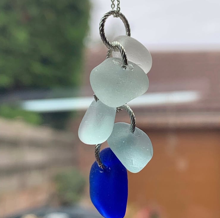 A cascade of 5 seaglass pieces, with colours from white through to cobalt blue, are connected by Sterling silver twisted rings to form a unique, eyecatching pendant attached to a Sterling silver chain that adjusts from 18 to 20 inches.
