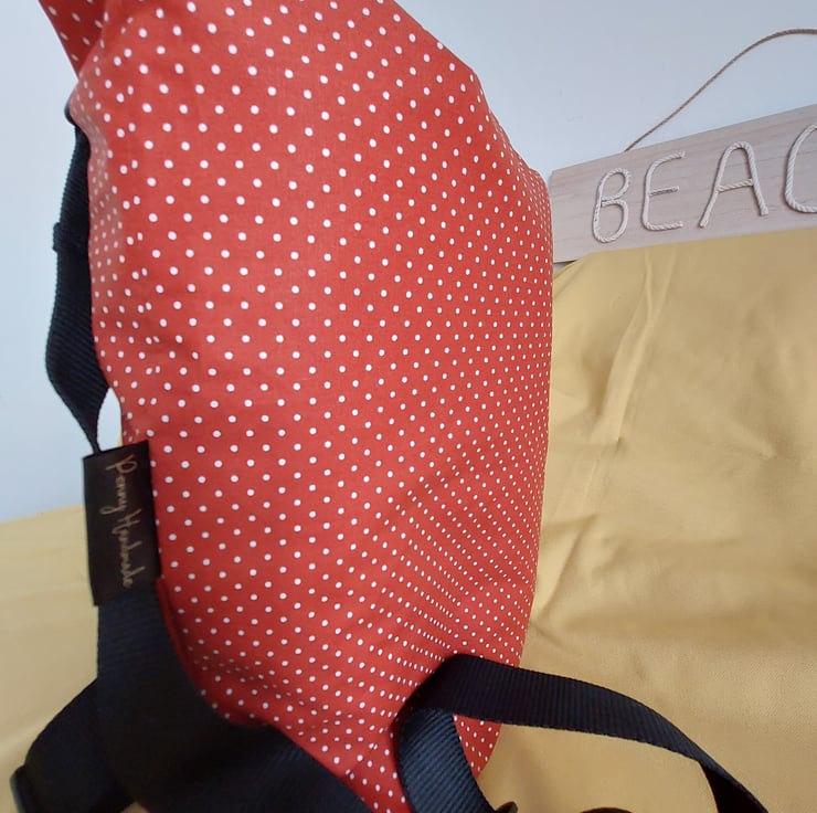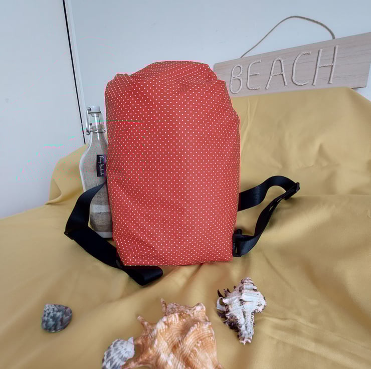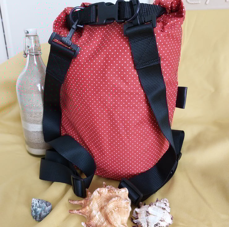 Drybag rucksack, measuring 42cm length x 31cm in width. Depth of boxed corners are 12 cm. Drybag has a mustard rubberised waterproof lining with a handle inside for hanging out to dry. Outer fabric is a wipe cleancoated cotton. Rucksack straps are removable. Item has a rolltop using webbing and is secured with a clip fastening.