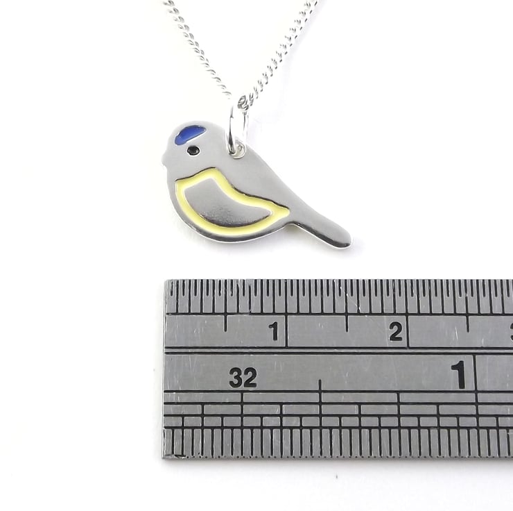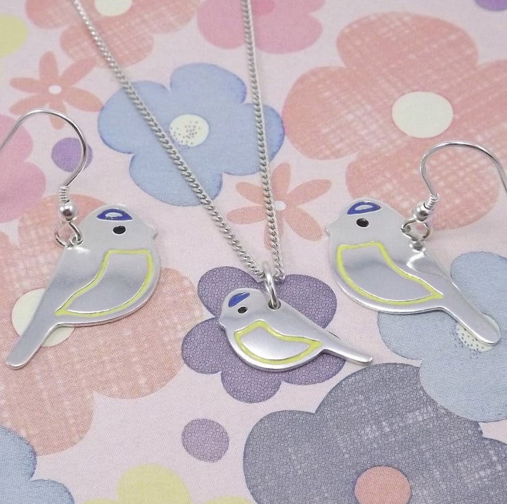 This blue tit jewellery set includes a pendant and a pair of drop earrings which have been lovingly crafted by hand. They've been made from recycled sterling silver and are etched before being cut out with a piercing saw, the edges are then smoothed using files and emery paper before it's carefully given their shape using a punch and hammer. Black, blue and yellow resin based enamels are added to the etched areas before they are polished. They are sent in boxes made from 80% recycled card.