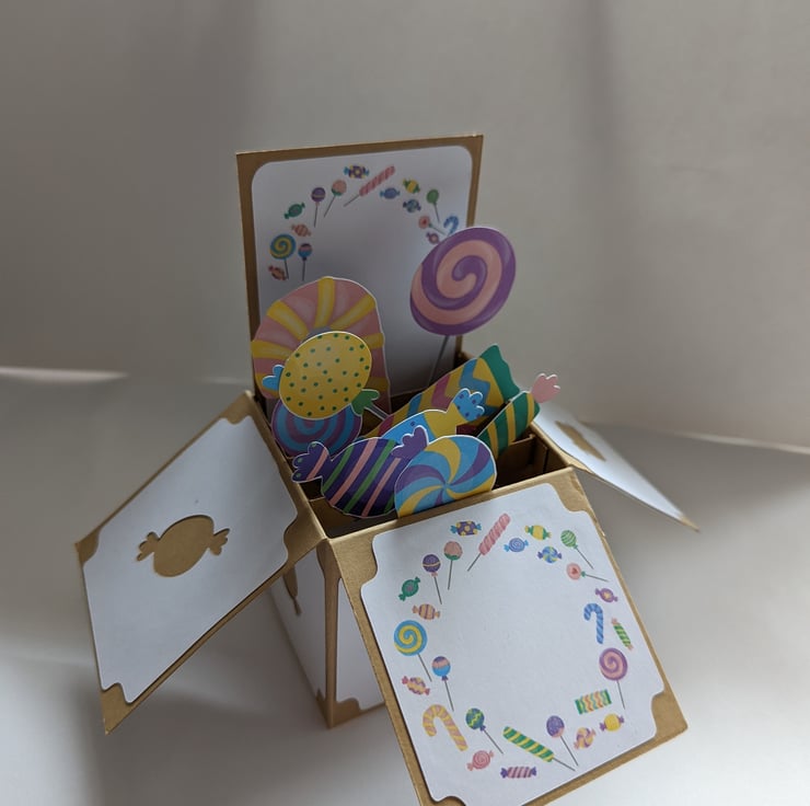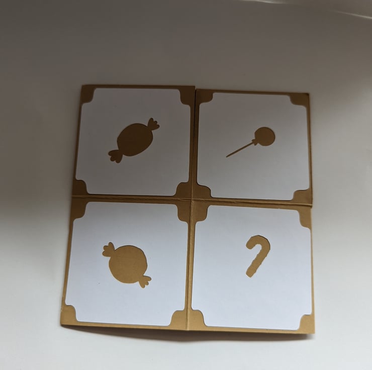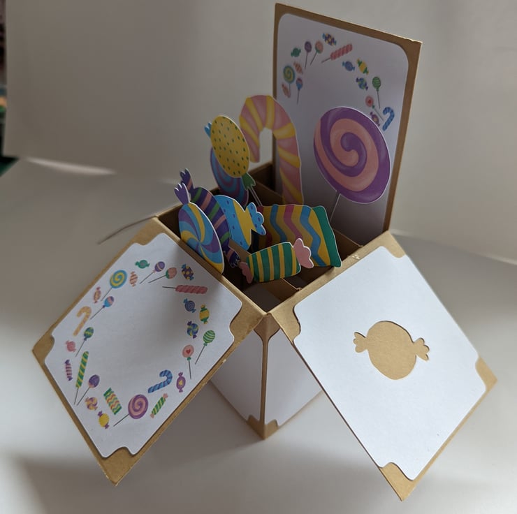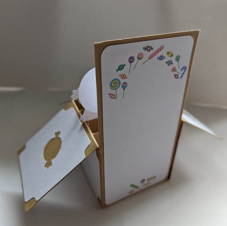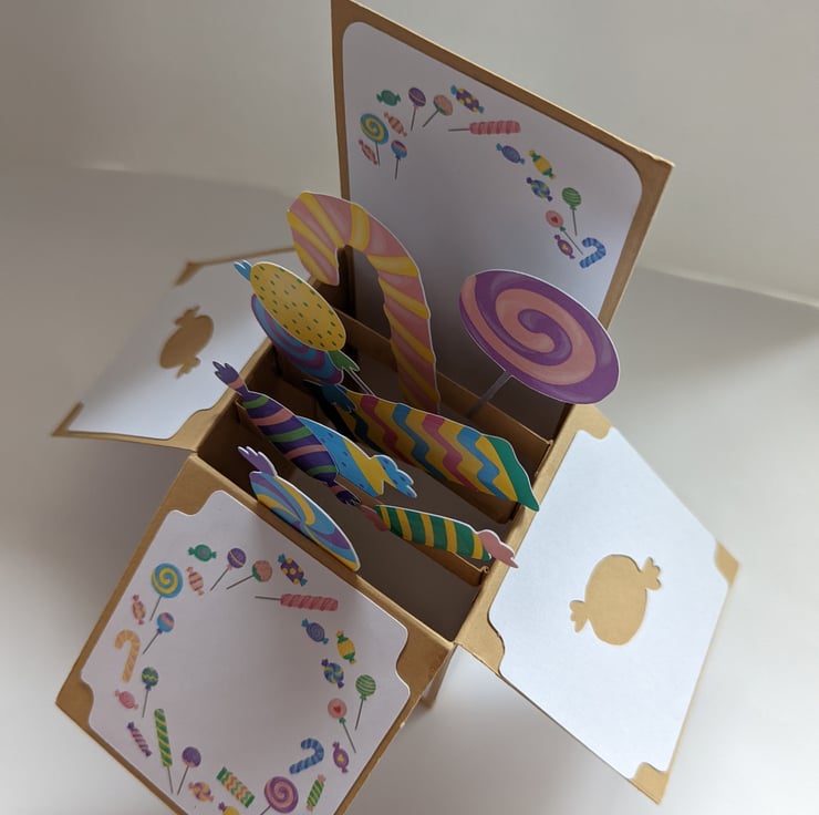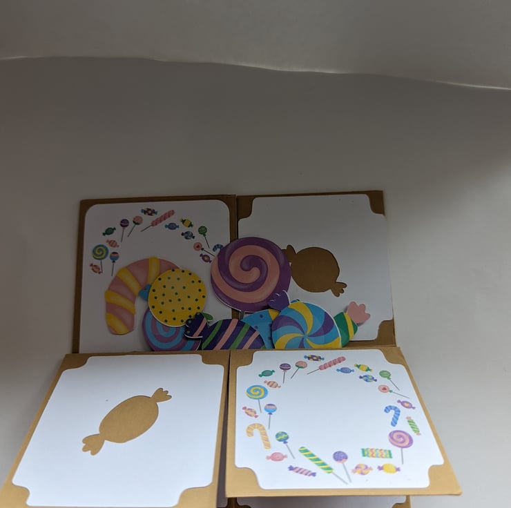 The Kraft coloured base of this card has been decorated with white toppers with sweet shapes cut from them. the front panel has a little circle of sweets and the main part of the card has die cut sweets and lollies.