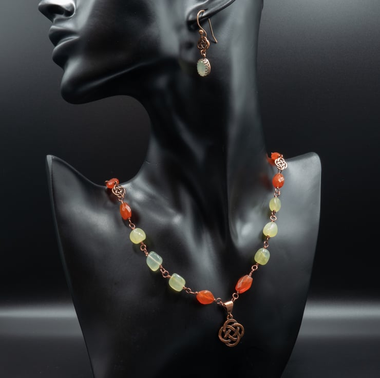A gorgeous mix of burnt orange carnelain and soft green jade hand linked with copper plated antique tone wire.