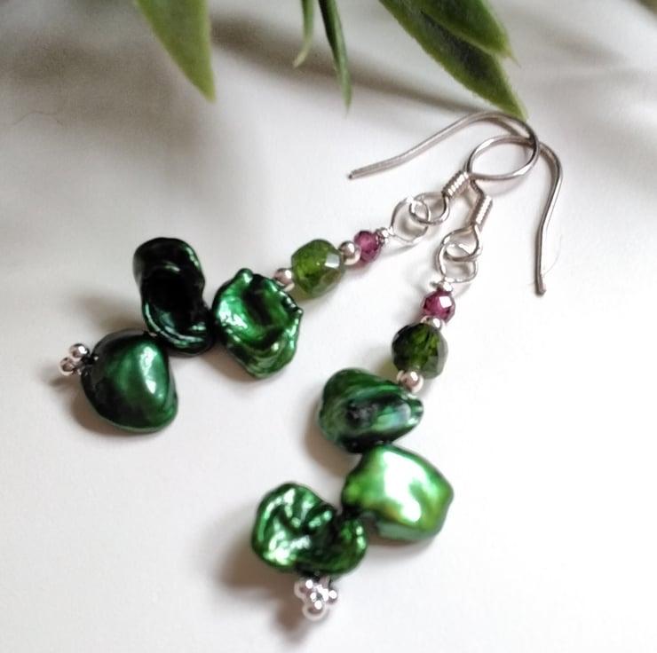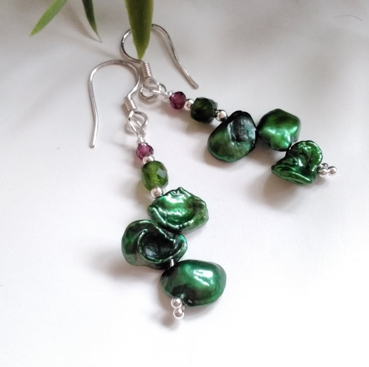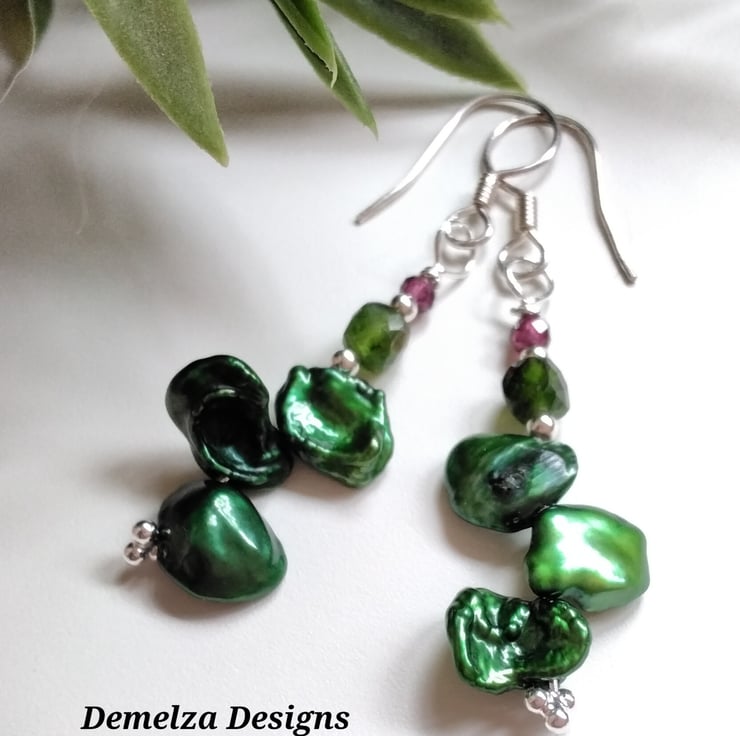 A beautiful pair of eye catching earrings designed and hand crafted using quality green Keshi pearls, drum faceted cut Russian Chrome Diopside and 3mm faceted rare Rhodalite garnets. Between them are 925 2mm sterling silver spacer beads. All other components are 925 sterling silver.