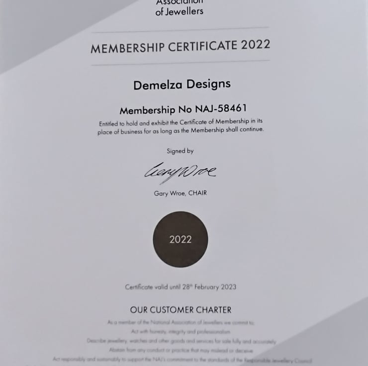 Demelza Designs is a registered member of the uk's largest prestigious 'National Association of Jewellers' (NAJ) since 2015 having met their vigorous vetting processes within the u.k jewellery industry. All members must abide by their professional customer charter and confirm to all u.k. Distance selling legislation and Trade Description legislation.