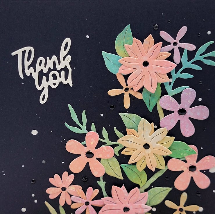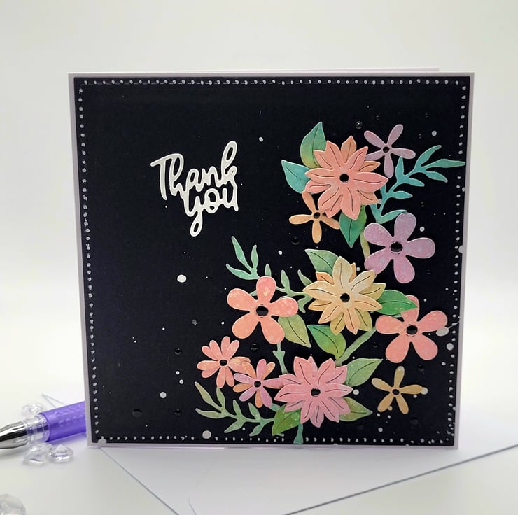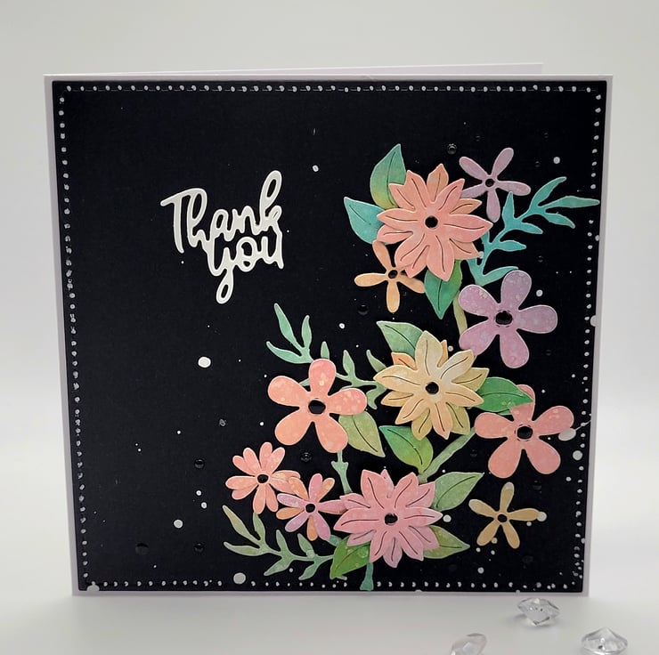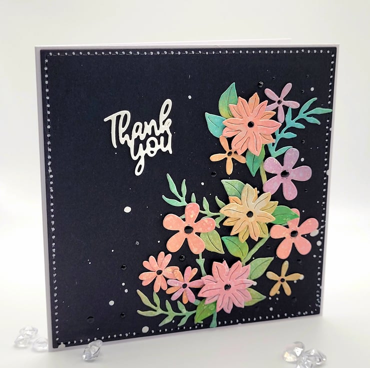 The white card base measures 12.5 cm x 12.5 cm and has a layer of black card with a hand painted dot border. I die cut a Thank You sentiment from white card and added white acrylic paint splashes for texture.