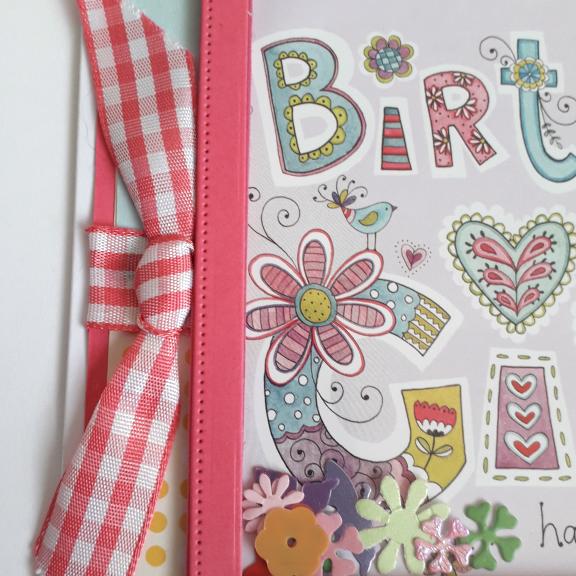 I have added a pink frame and a split background of green and yellow spot patterned papers then more pink card, and the base card is white. There is a strip of pink gingham ribbon across the middle of the card and a bow to the left side and 3 gems to the bottom right hand corner, the card is a 17cm square.