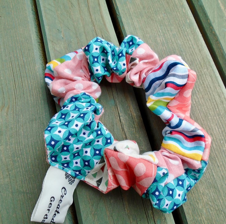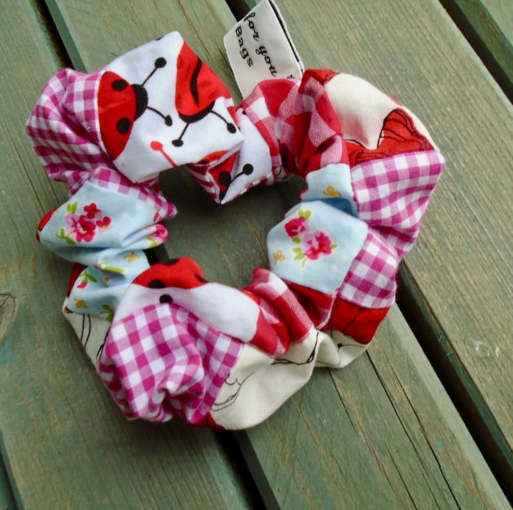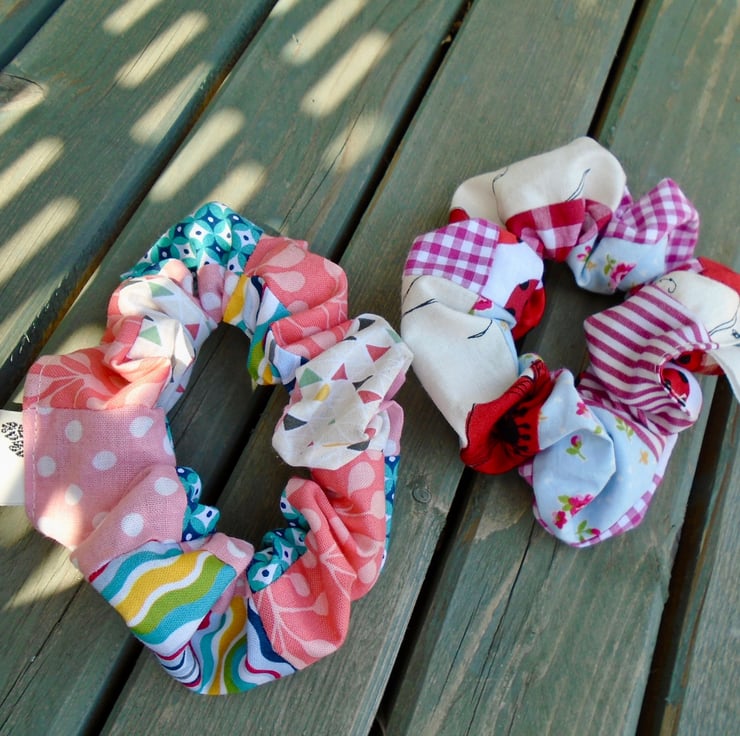 A couple of lovely scrunchies , made in various pretty cotton fabrics . Each scrunchie winds round 2 - 3 times , depending how thick the hair is