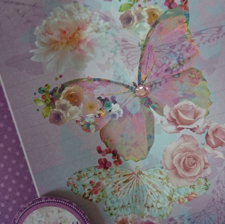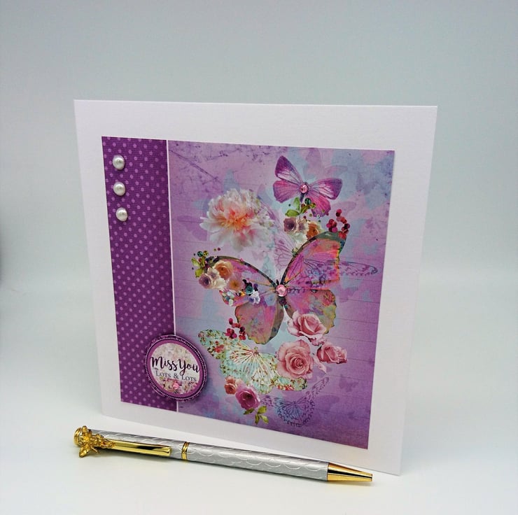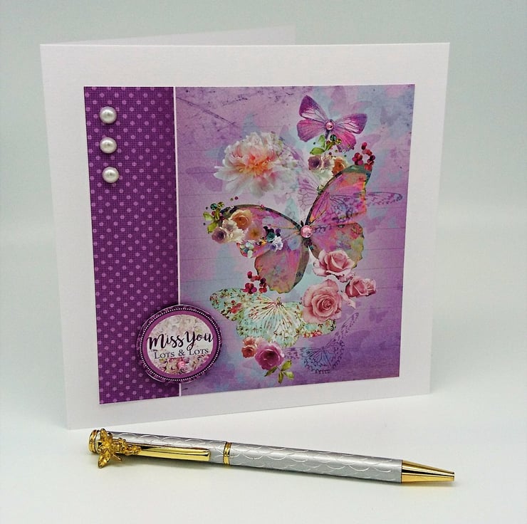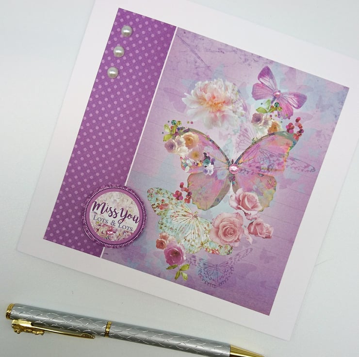 DESIGN: Top quality white card layered with gorgeous purple, pink and white Hunkydory design - Beautiful purple polka dot panel with delicate butterflies and flowers. Embellished with three pearl gems and three co-ordinating pink gems, complete with raised sentiment. Handmade with love in my wee studio in Argyll, Scotland.
