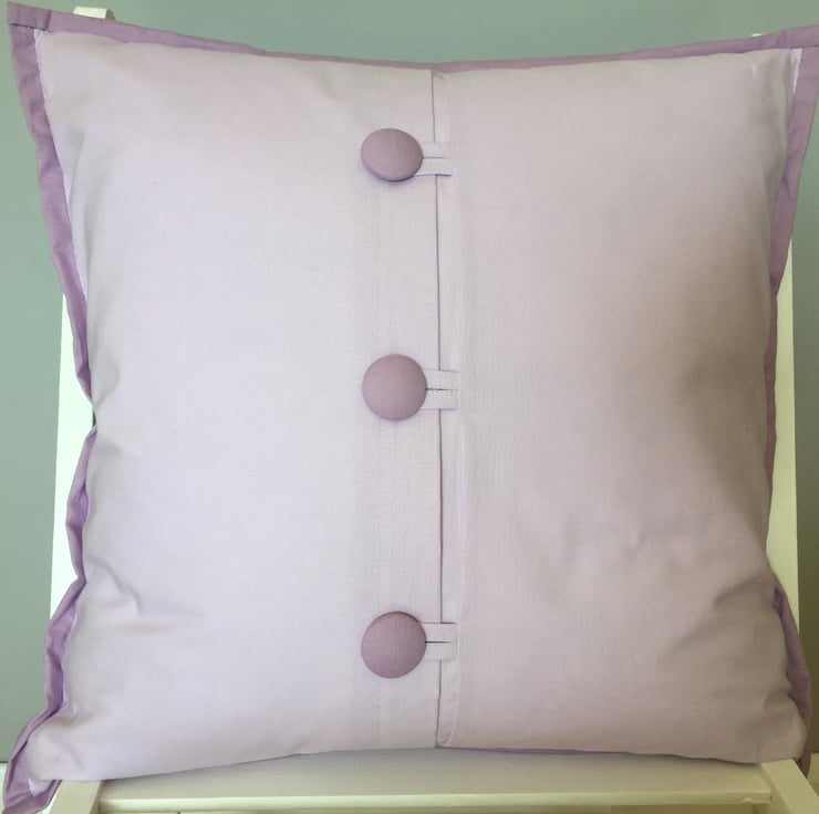 The split backing of the cushion has been made with pale lilac-pink cotton. There are three loop and fabric covered buttons for closures. The outside edges of the cushion have been finished with a slightly darker lilac-pink binding.