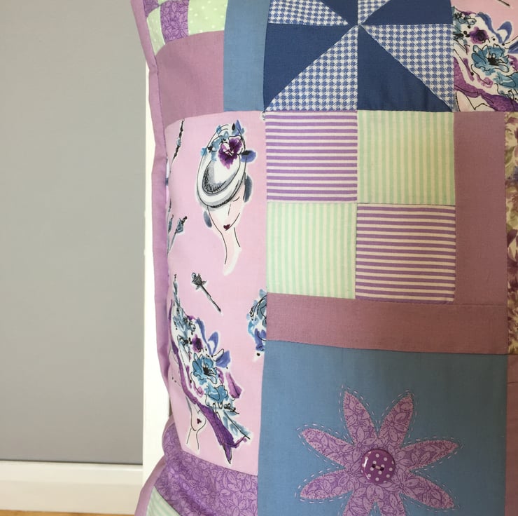An 18”(45cm) square cushion front of various small patchwork and applique panels inspired by a lilac-pink cotton fabric featuring ladies’ hats. Several panels of this fabric have been used together with other fabrics picking out other colours, namely pale green and blue.