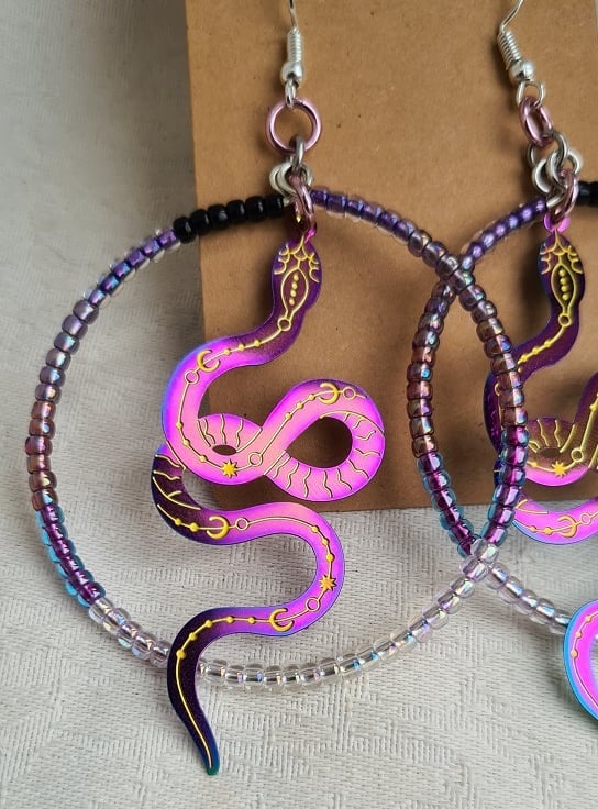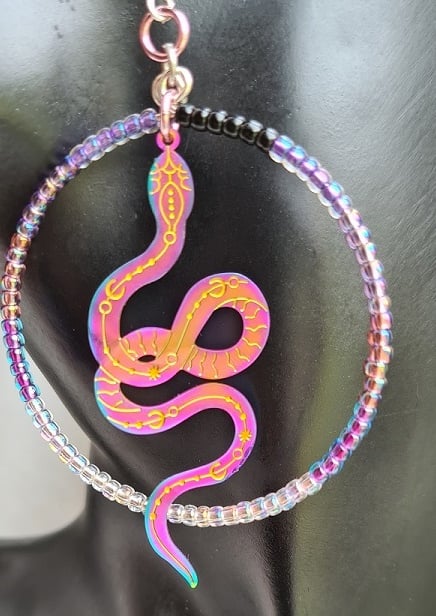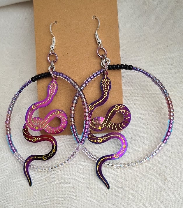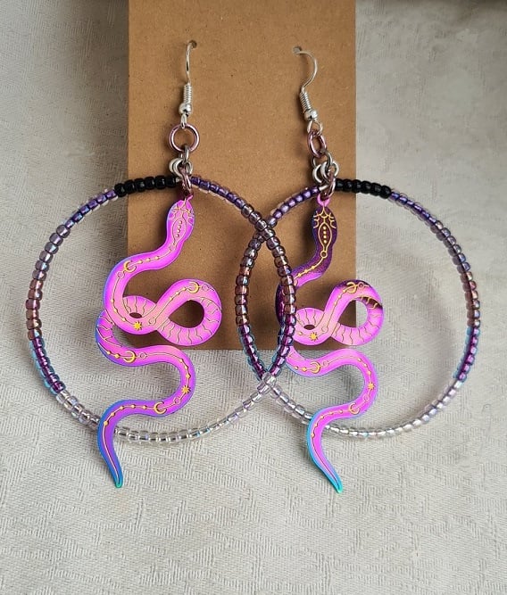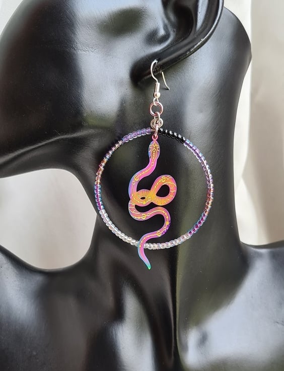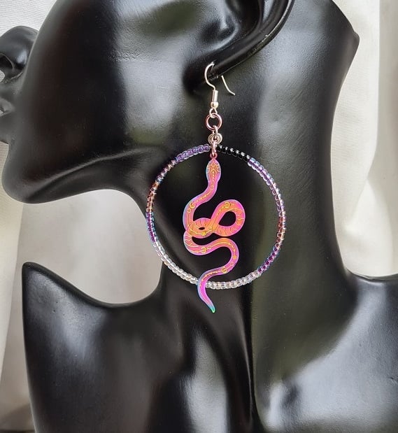 Earring length is approx 9.5cm long from the top of the ear wire to the bottom of the Snake charm. Ear wires are Silver Tone Stainless Steel (if you require alternative ear wires please go to the Choose Options Box). Snake charms are Stainless Steel in a Rainbow- Iris colour (Mainly Pinky-Purple). Seed beads are various Purple tones, AB Clear and also Jet Black and are Glass.These tiny beads are on round memory wire.