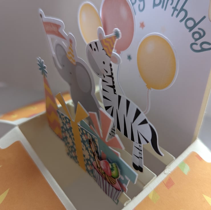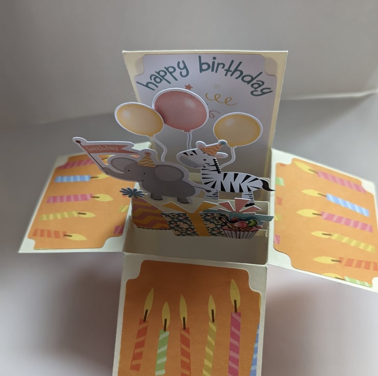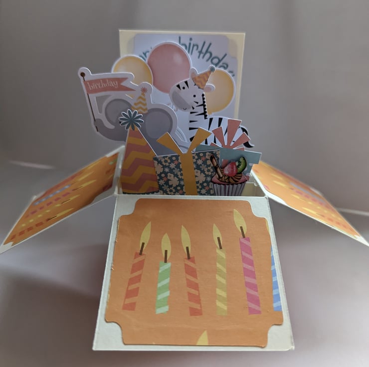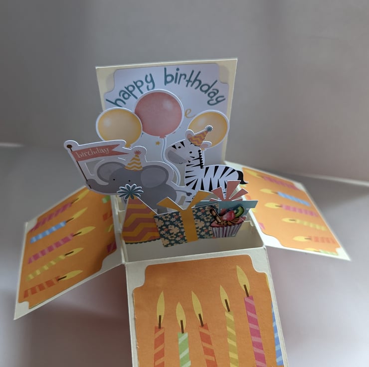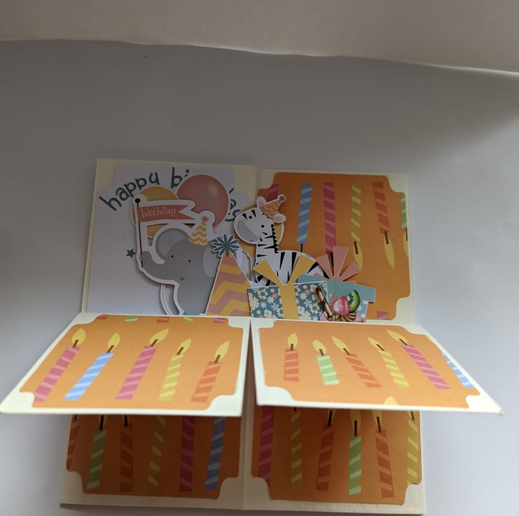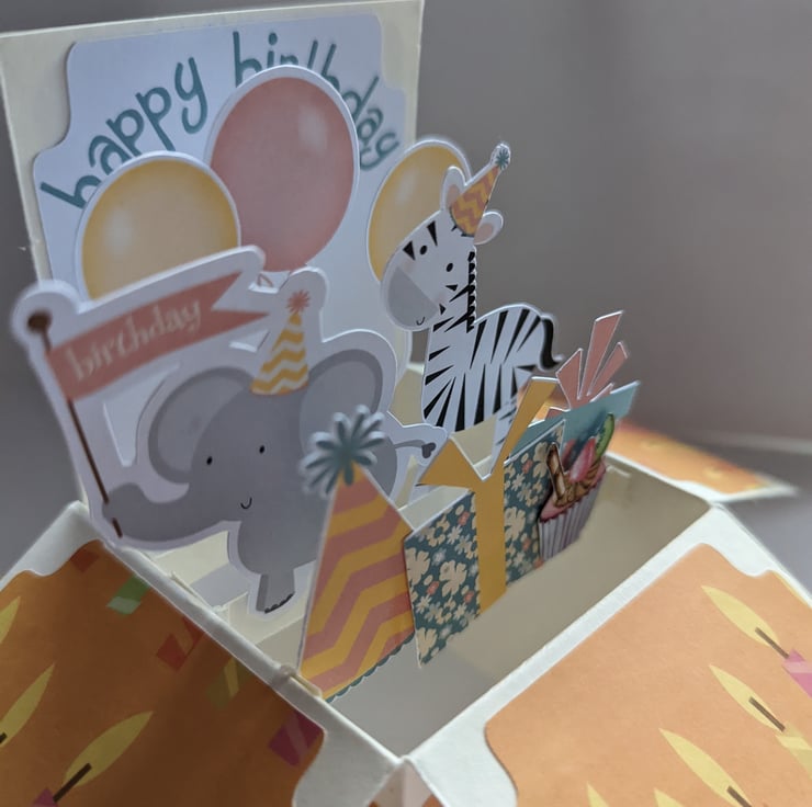 The cream base of this card has been decorated with party papers and the panels topped with cake & presents with cute little elephant and zebra ready to party and the back panel reads "Happy Birthday".