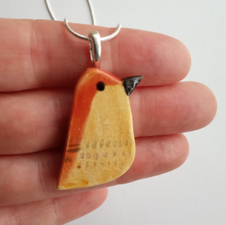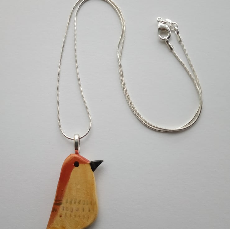 This sweet little ceramic bird is bright and vivid, it hangs from an 18" silver plated snake chain.