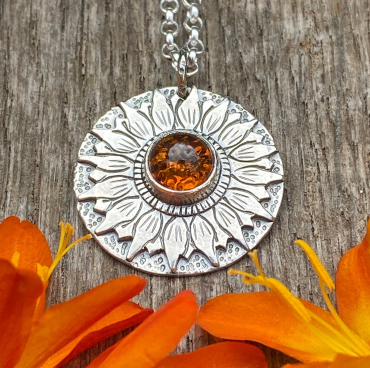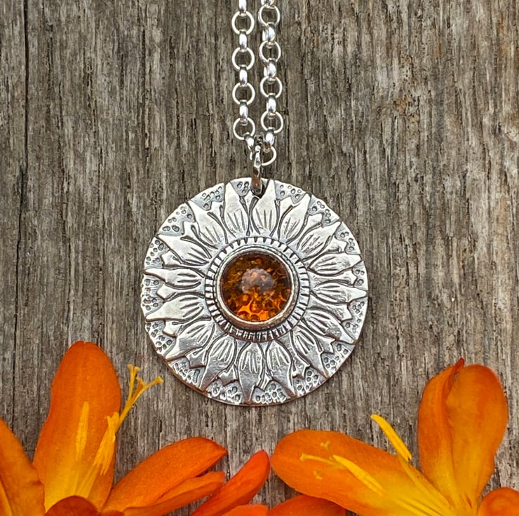 Made using traditional jewellery making techniques, including piercing out shapes with my jewellers saw, soldering, filing, hammer texturing, metal stamping and hand engraving. The finished pendant is oxidised to highlight detail and is set with an 8mm amber cabochon.