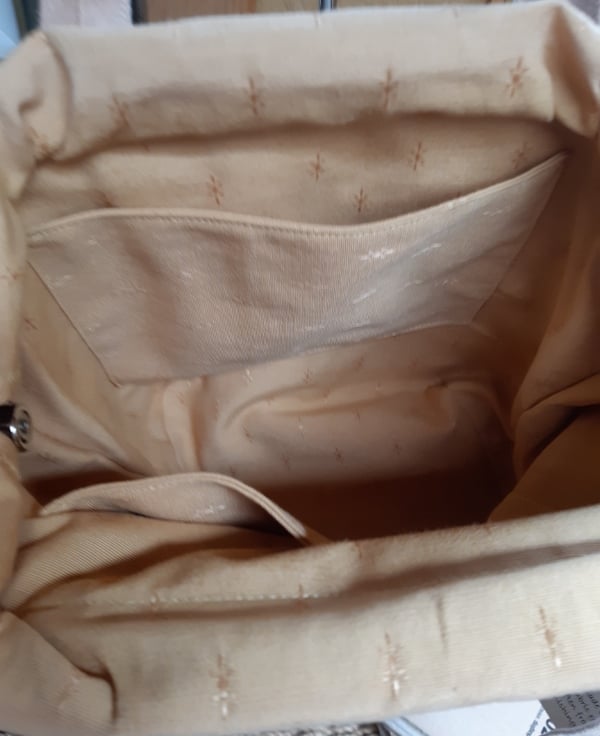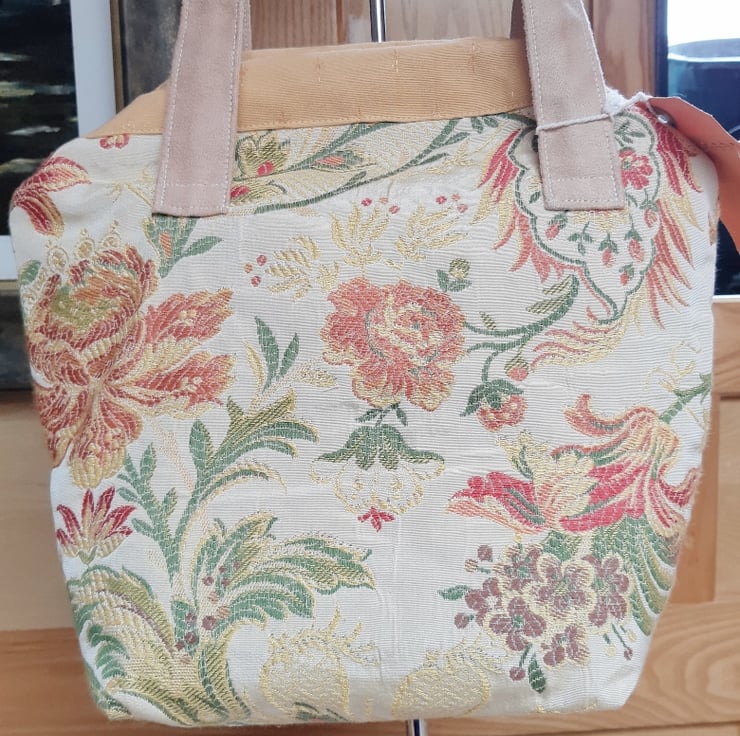 Brocade bag in shades of cream, red, gold and green, on a sprung frame for secure closure. Lined in gold cotton brocade, with inner pockets and faux suede handles.