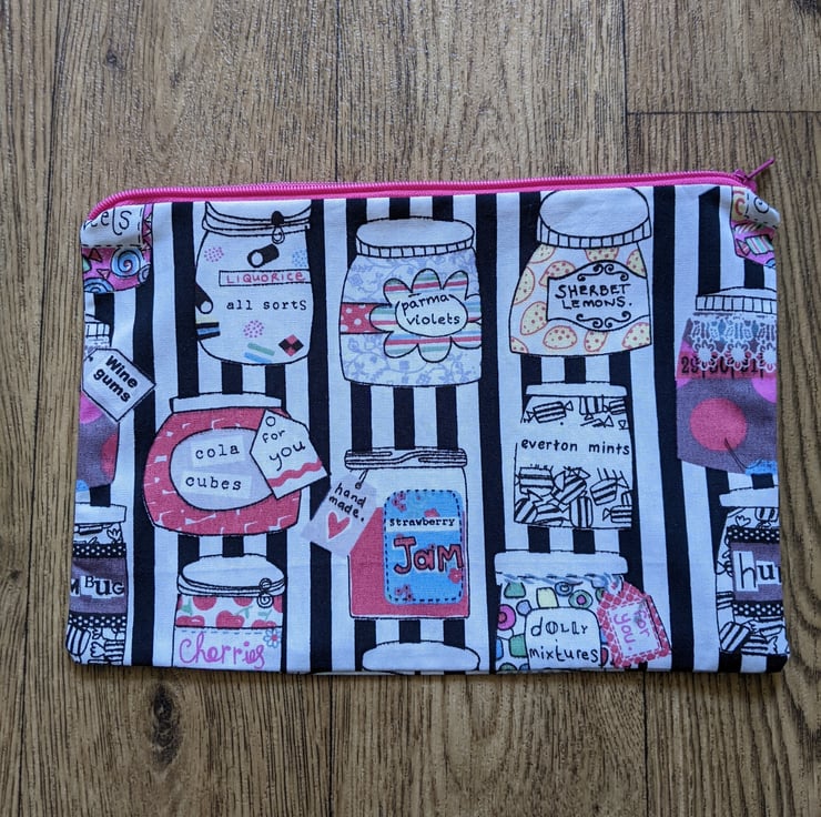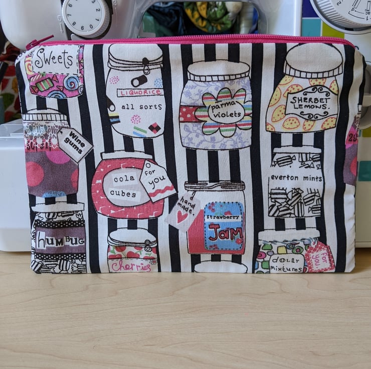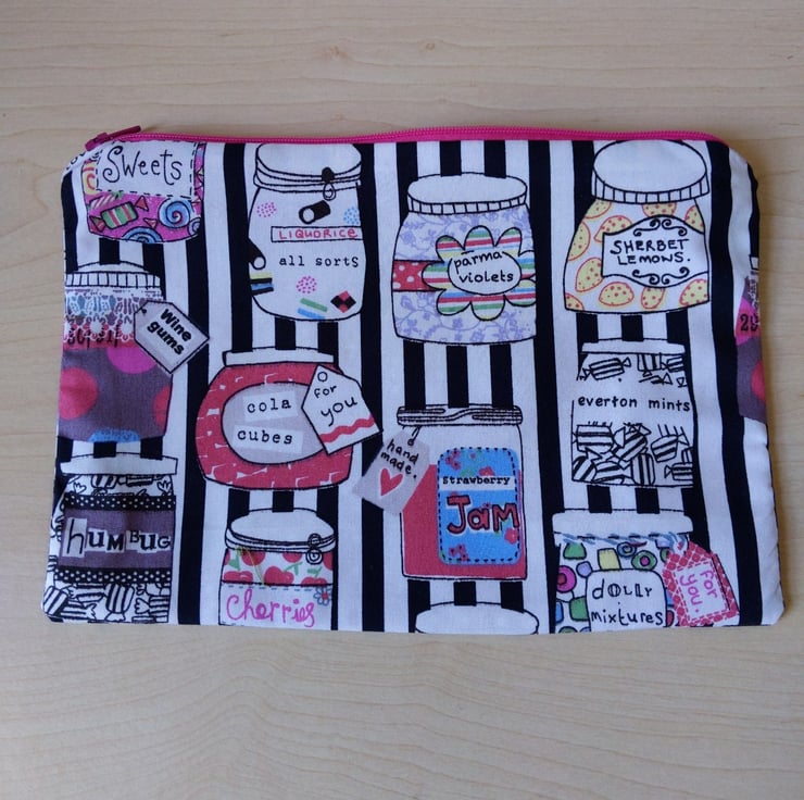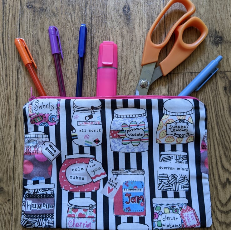 Fully lined, handmade pencil case made with 100% cotton fabric printed with sweet jars.