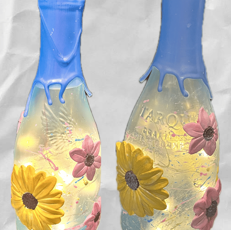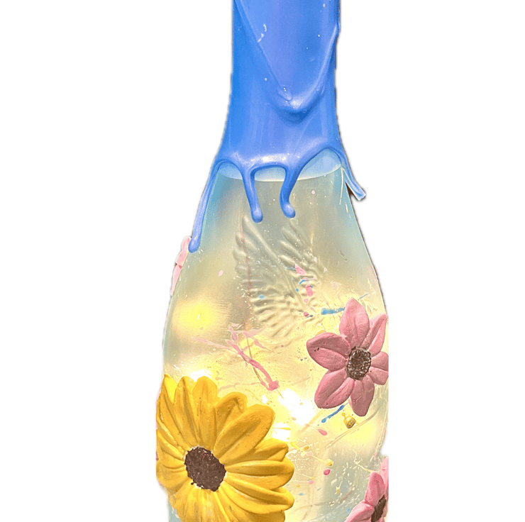 Bottle has been repurposed hand painted and varnished with adorable handmade and pastel painted flowers making this a truly striking and unique gift. The neck of the bottle has a wax effect and inside of bottle has cork string lights.