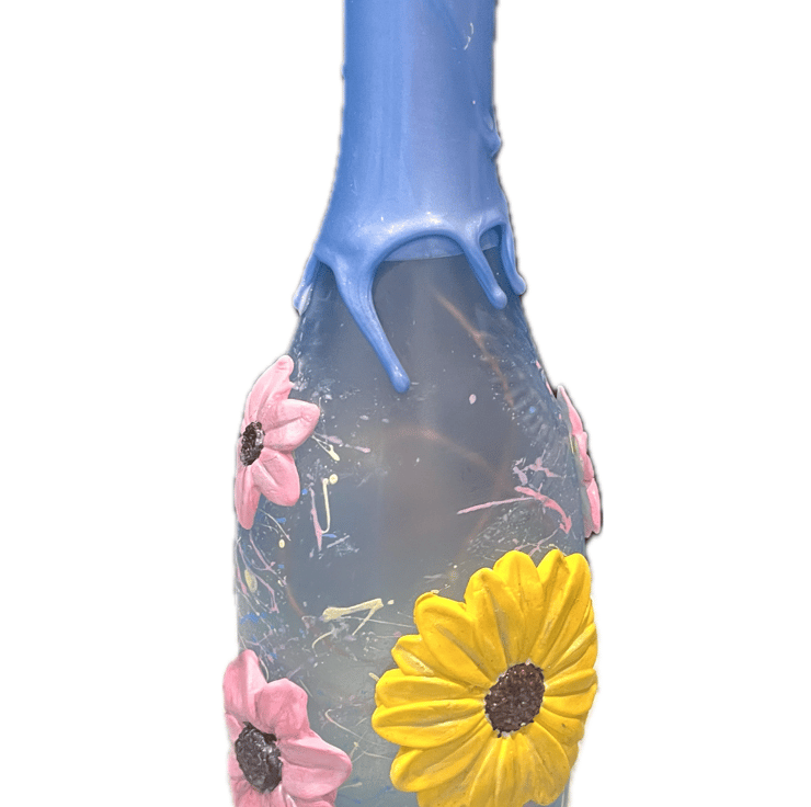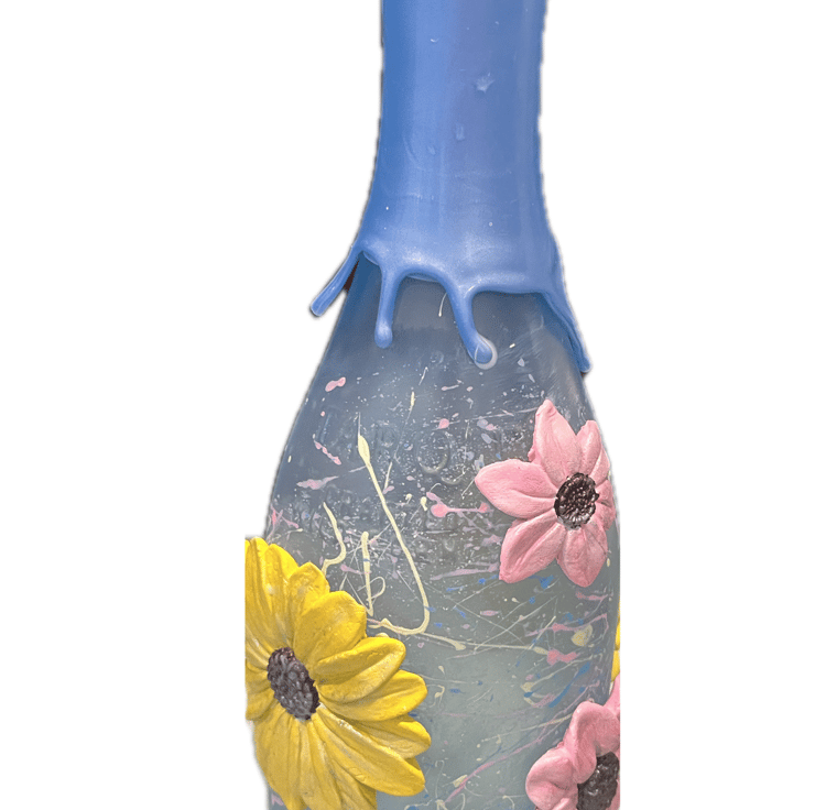Unique one of a kind hand painted up cycled bottle with beautiful handmade 3D clay flowers.