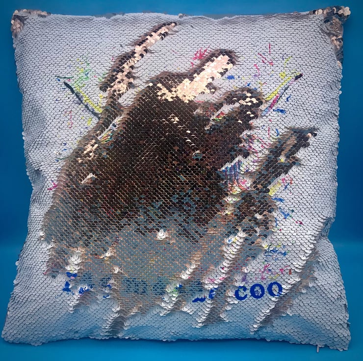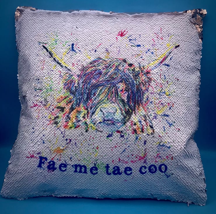 Gorgeous eye catching rose gold sequin reversible cushion. Front side is covered with double sided sequins which are rose gold on one side and white on the other, featuring a high quality sublimation print of a cute highland cow with Scottish fae me tae coo saying.