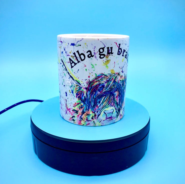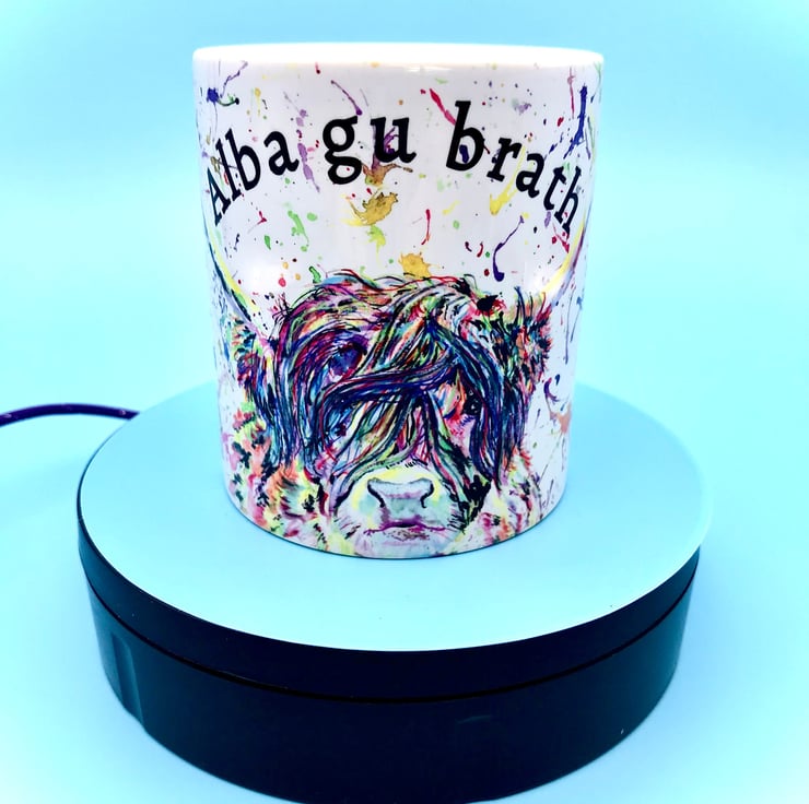 Beautiful mug, featuring print of a Scottish cow with the words Alba gu brath, which is a Scottish Gaelic phrase meaning scotland forever.