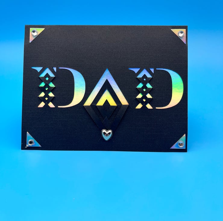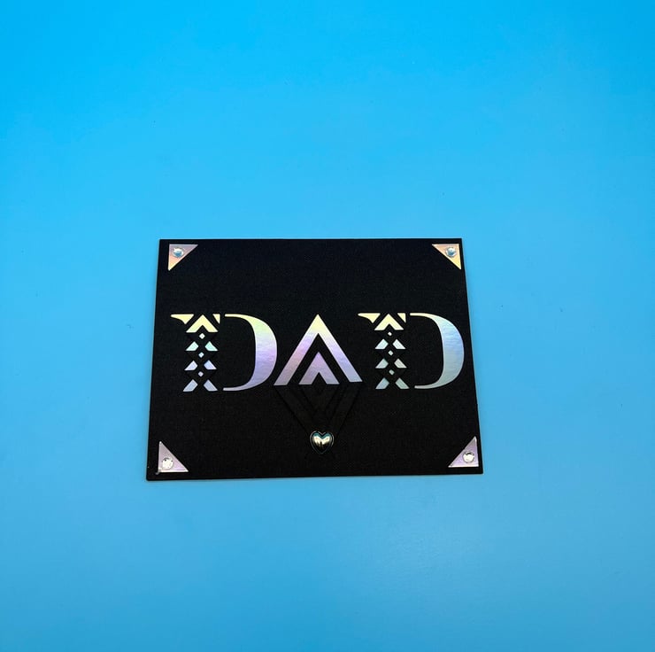 Striking black card with the word dad cut out and set against a silver holographic insert background, with a sliver heart rhinestone and 4 tiny silver gemstones in the corners.
