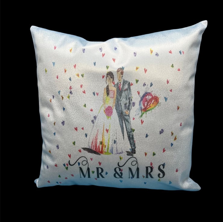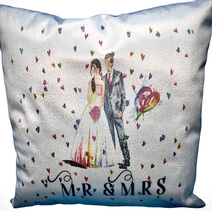 Sparkly silver glittery shimmer effect cushion with high quality sublimation design of bride and groom, which can also be personalised.