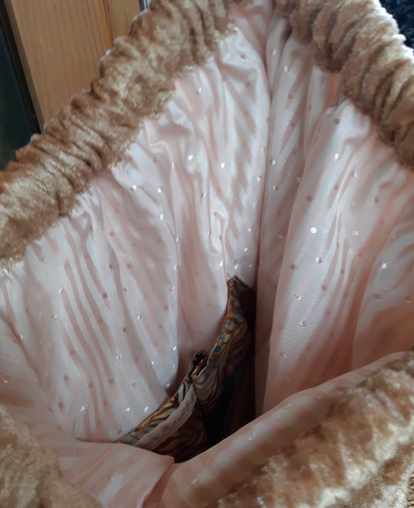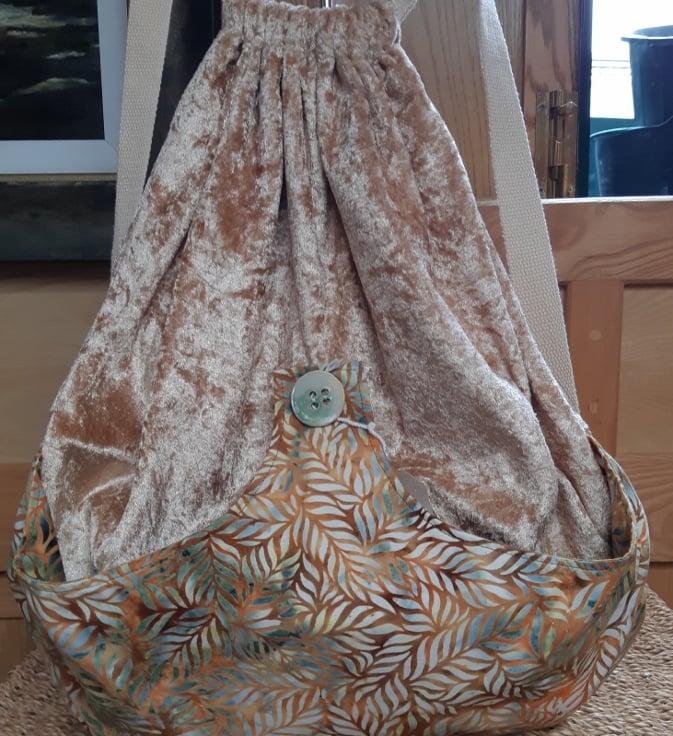 Gold crushed velvet backpack, with toning cotton batik front pocket and ceramic button trim. Lined with a pink striped satin, with inner pocket and adjustable soft cotton webbing straps which also close the bag securely.
