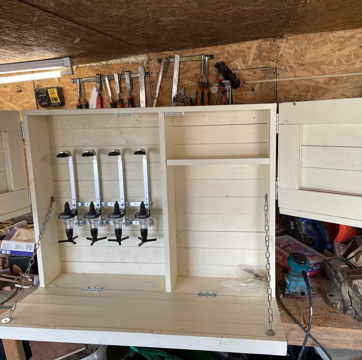 Drop down door which forms the bar shelf and barn style doors to give access to glasses and optics