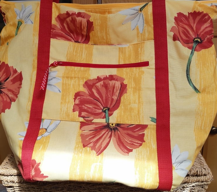 Large zipped printed cotton holdall, ideal for the beach, a picnic or a weekend away. Outer pockets, one with an additional zip, lined, with inner pockets, and soft cotton webbing straps which will sit comfortably on the shoulder.