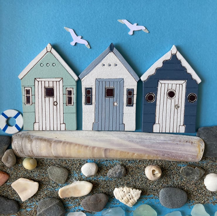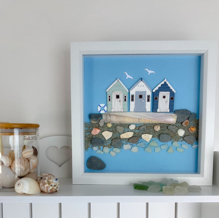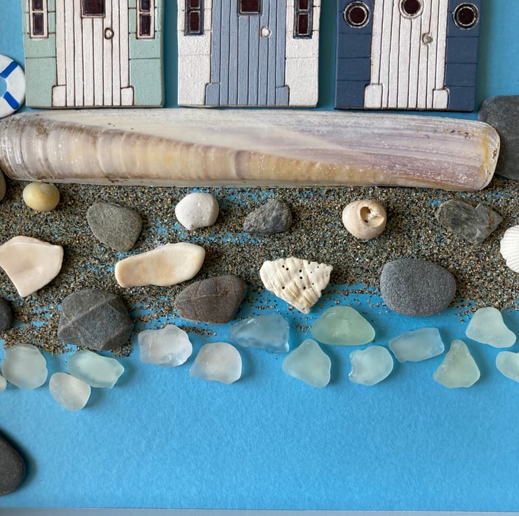 A lovely beach hut picture handmade with pebbles, shells, sea glass and sand from the beaches of Cornwall.