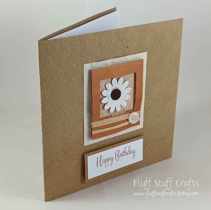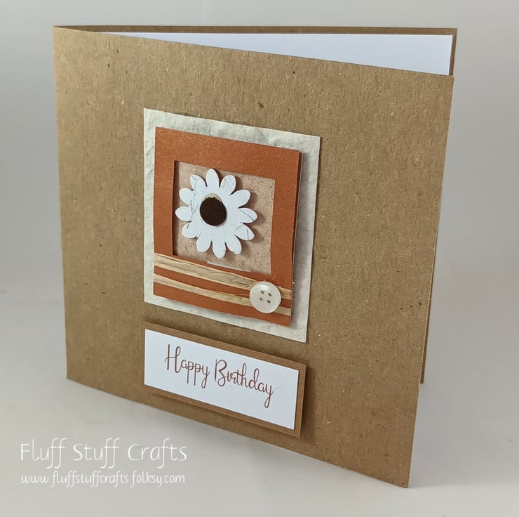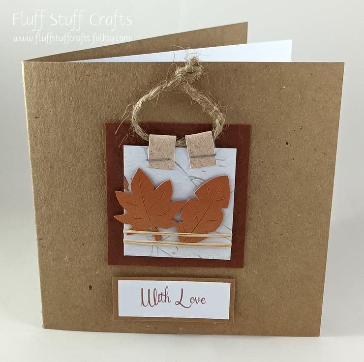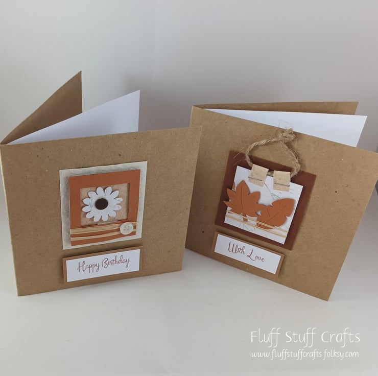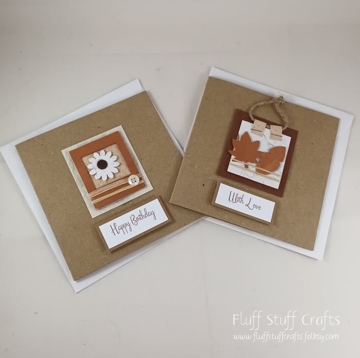Pack of two greetings cards, one 'birthday' and one general 'with love' which could be used for multiple occasions. They are nature themed toppers on recycled kraft card. The birthday card has a flower topper, the 'with love' has a leaf topper. The inserts are left blank for your own message.