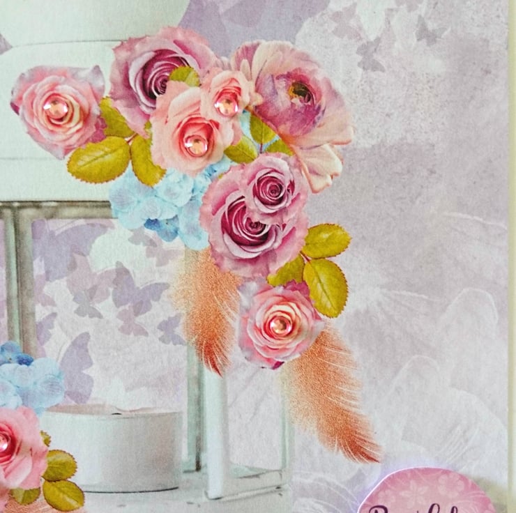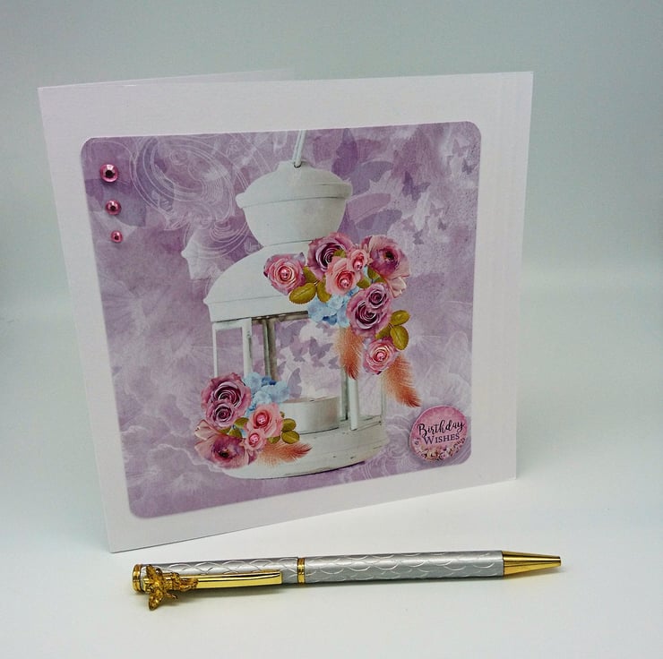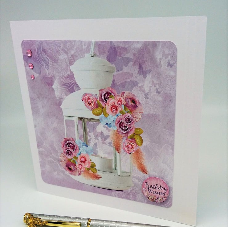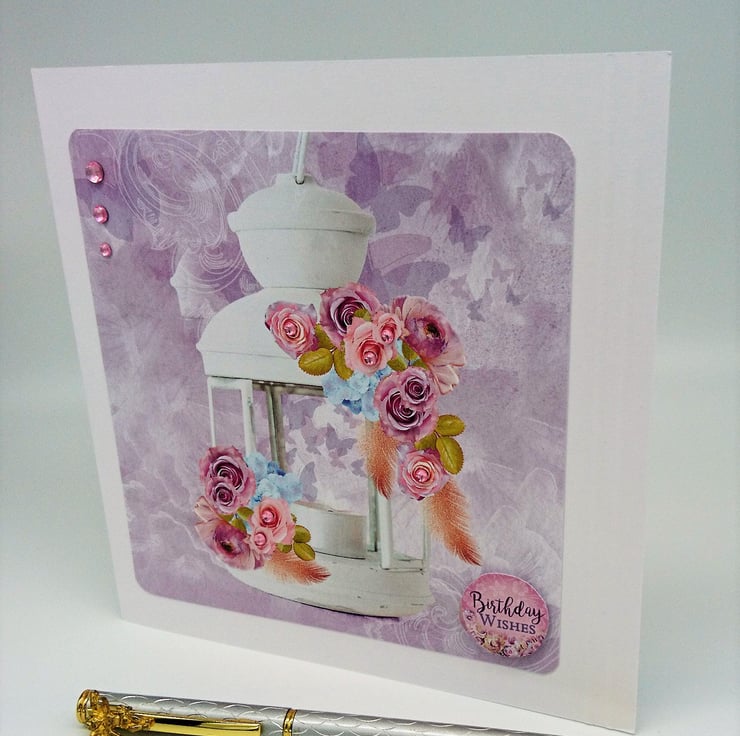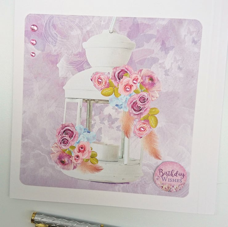 DESIGN: Top quality white card with two embossed lines on right hand side. Layered with Hunkydory design of beautiful white hanging lantern decorated with pink and lilac roses on a soft coloured background of flying butterflies. Some of the roses are embellished with co-ordinating pink gems, plus a row of three pink gems top left, complete with raised matching "Birthday Wishes" sentiment. Handmade with love in my wee studio in Argyll, Scotland.