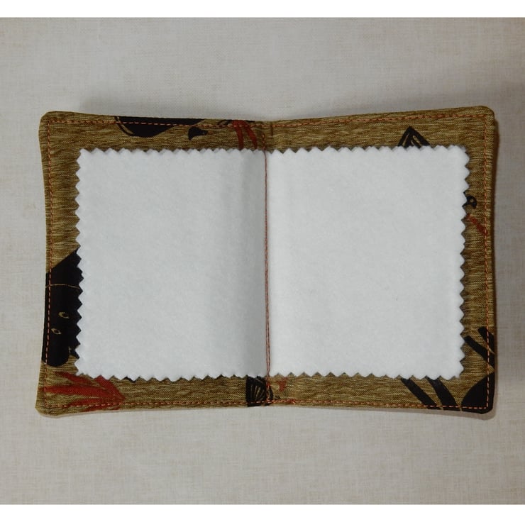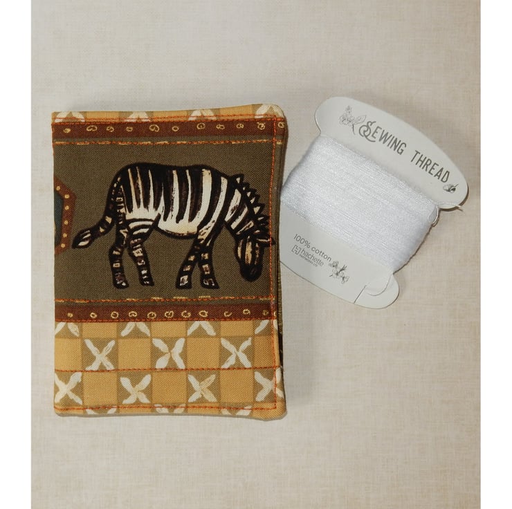 A fun needle case, featuring a cute zebra (with another zebra on the reverse). It measures approx. 4.5 x 3 inches , and it is lined in toning animal print fabric and has four felt leaves for your pins and needles. It has a layer of wadding for protection and has been quilted to enhance the effect.