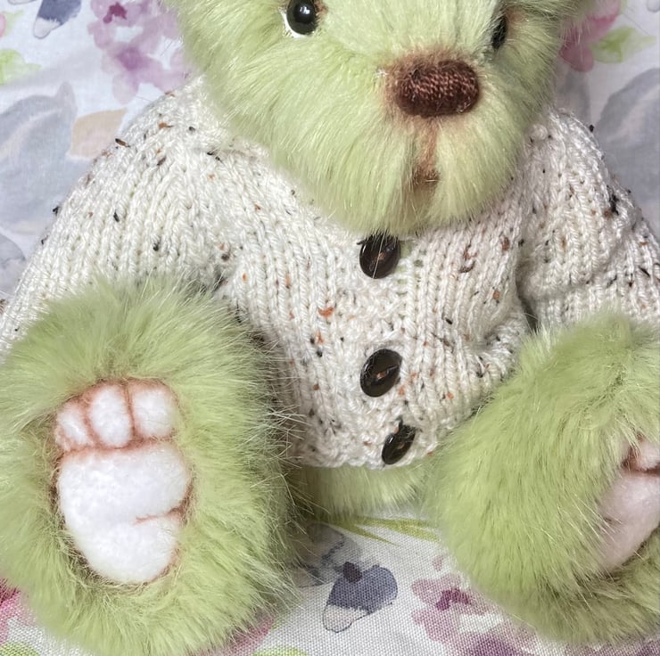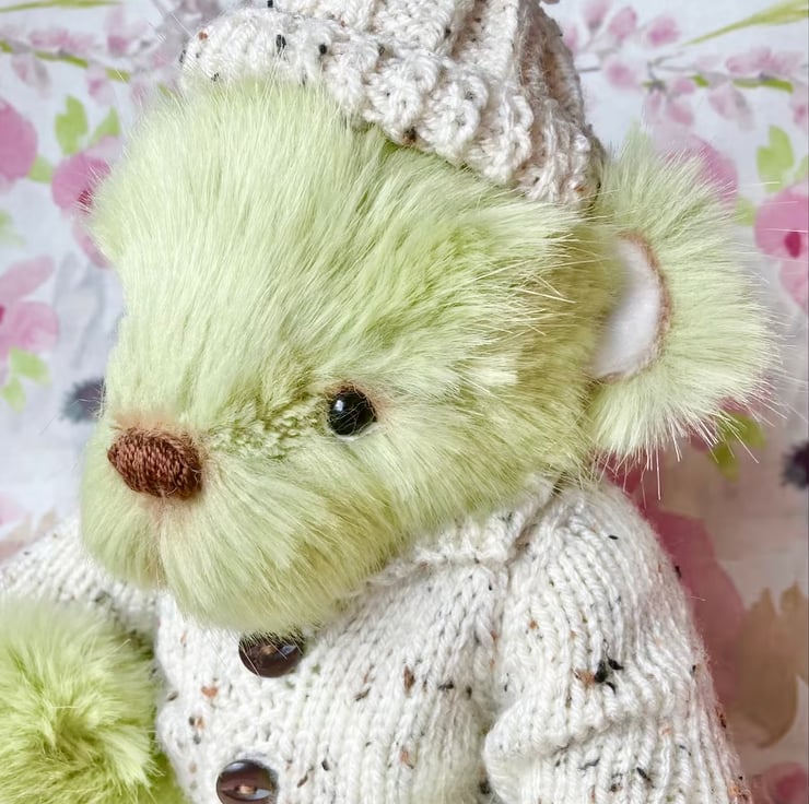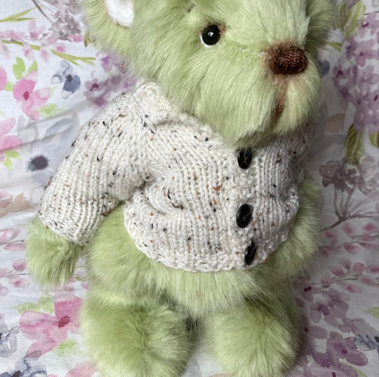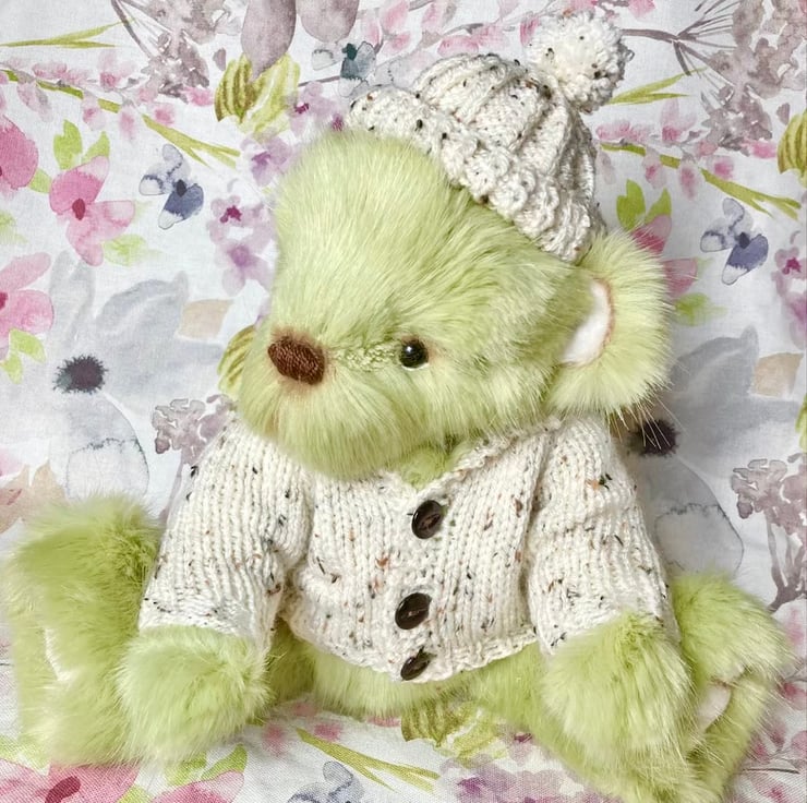Quentin is a beautiful silky soft sage green bear with brown accents and decorated with a woolly cardigan and bobble hat to keep him warm.