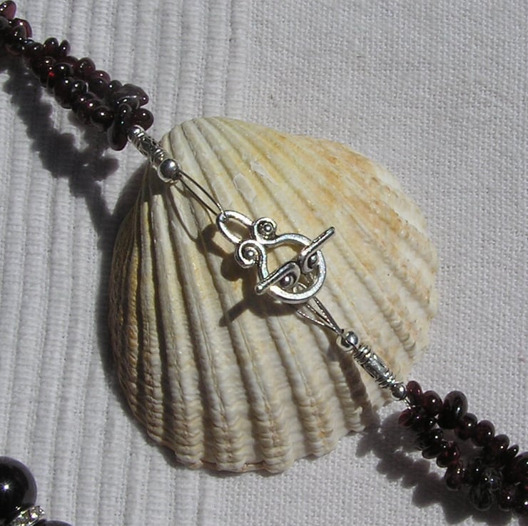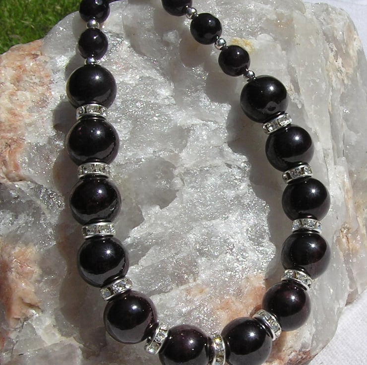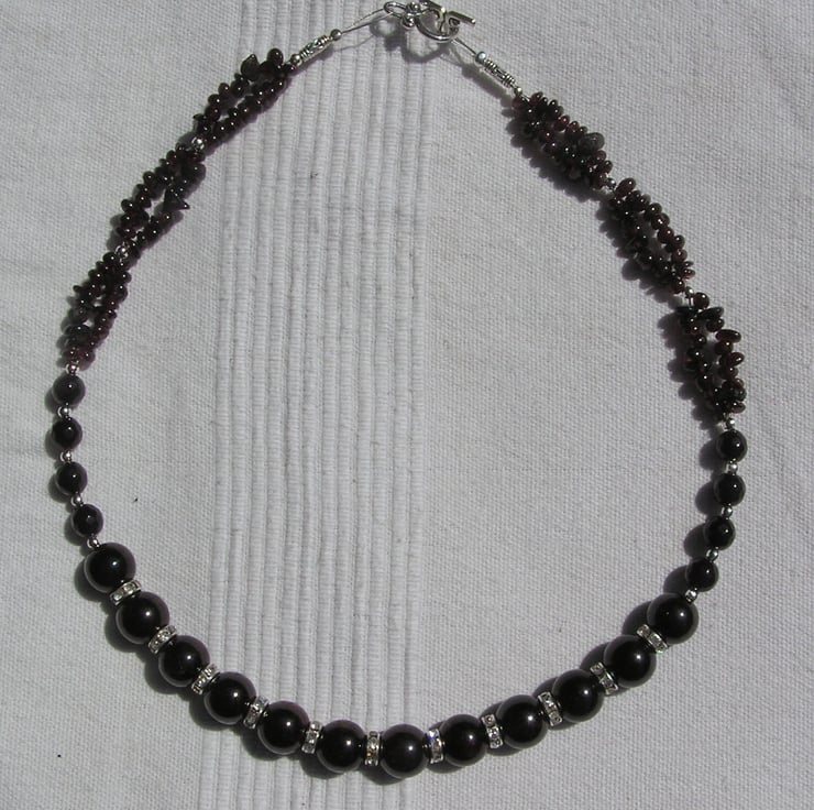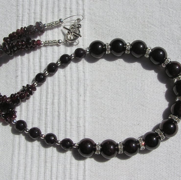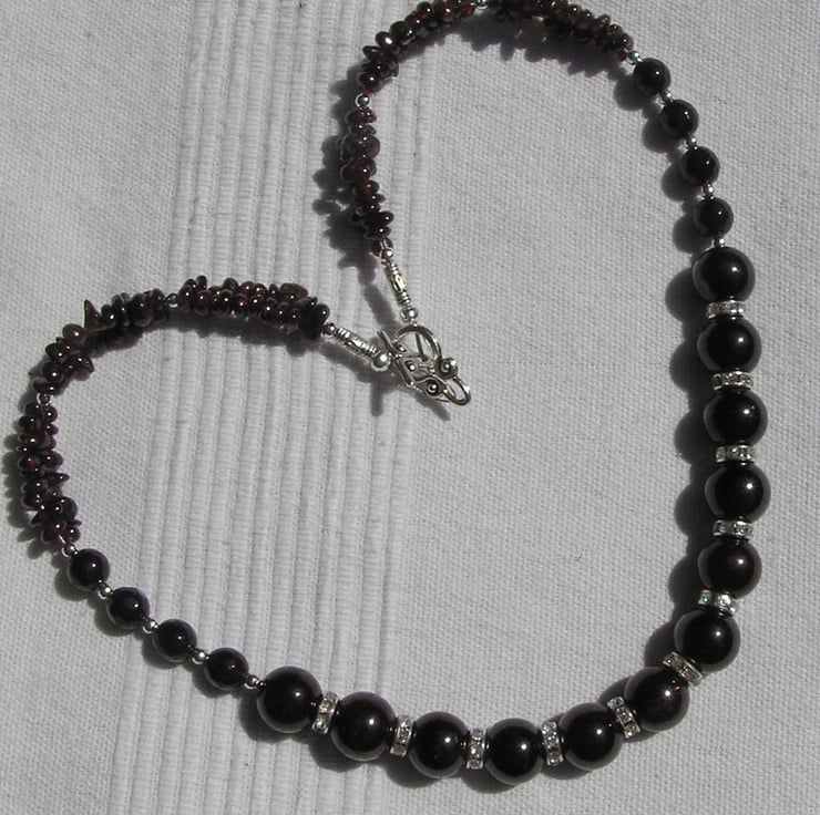 This Stunning Necklace is made from Deep Red Garnet round beads (Large & Small) alternated with Glistening Crystal studded spacers finished by double-stranded Garnet Gem-Stone Chips - a Regal Rich effect that will look stunning either worn casually or with something more Elegant for a Special Evening out