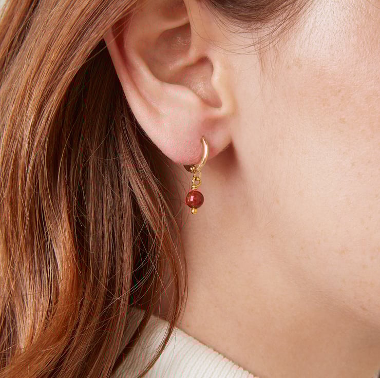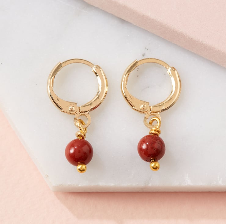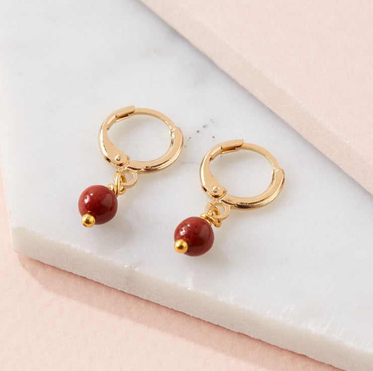 Small gold-plated hoop earrings with a fiery red gemstone pendant made from jasper.