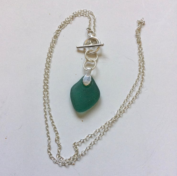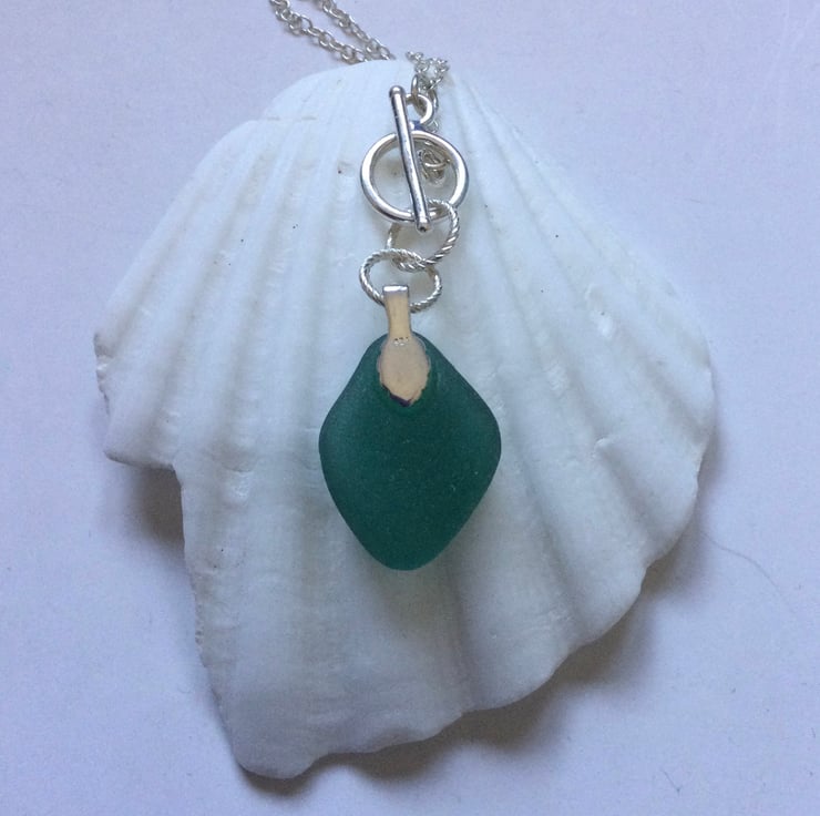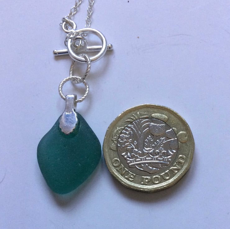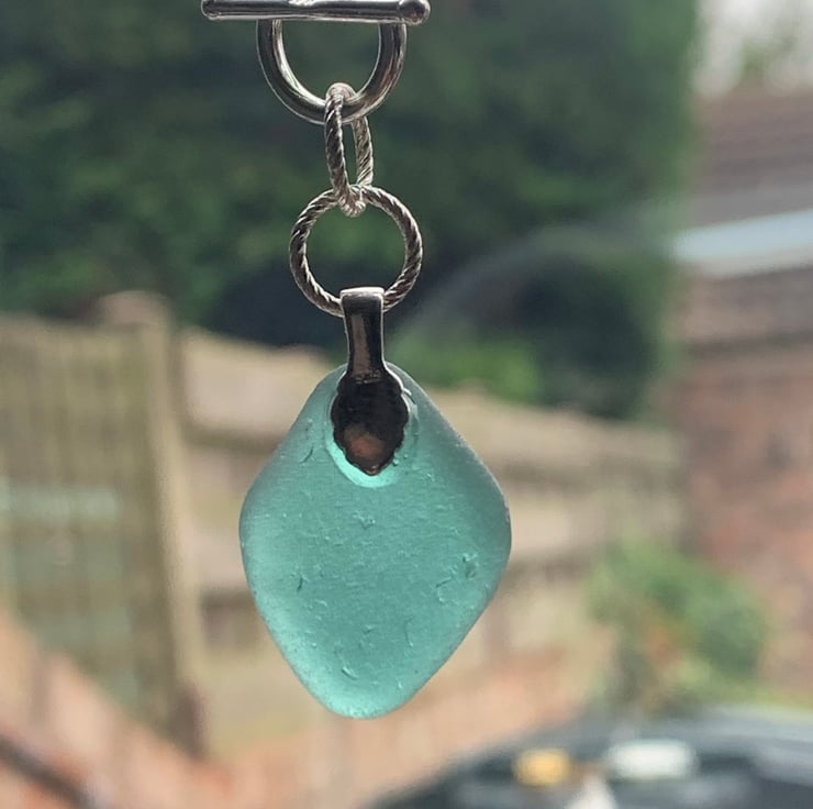 This beautifully smoothed, teal green piece of seaglass has been attached by twisted silver rings to the ring of a ring & bar fastener to create an eye catching and unusual pendant. The Sterling silver chain is 20ins in length. See photos.