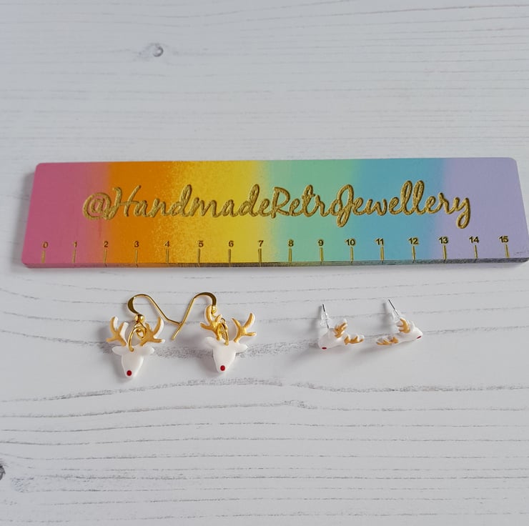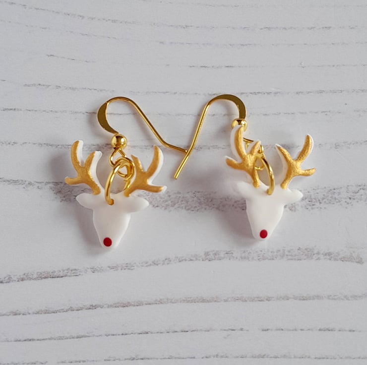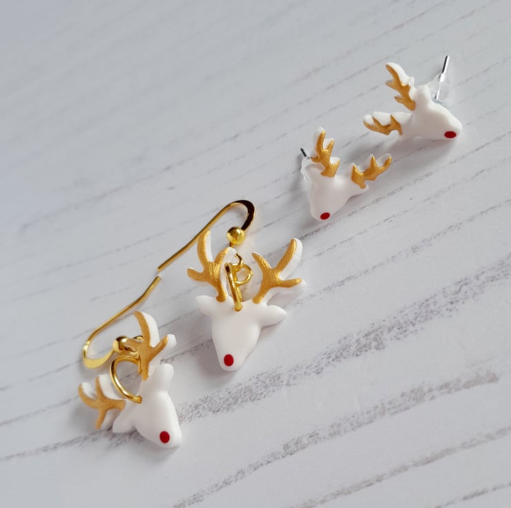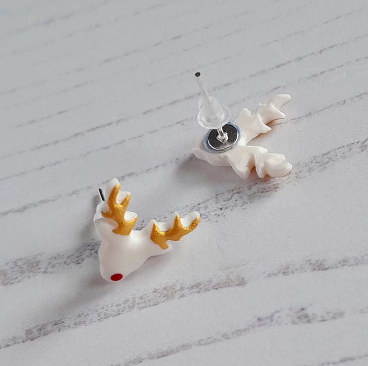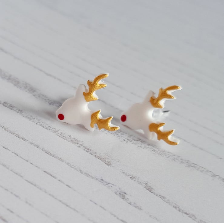 Beautiful and delicate tiny stag head shapes made of white polymer clay, with gold antler detail hand painted, plus a bright red nose!. Perfect for any Christmas outfit.