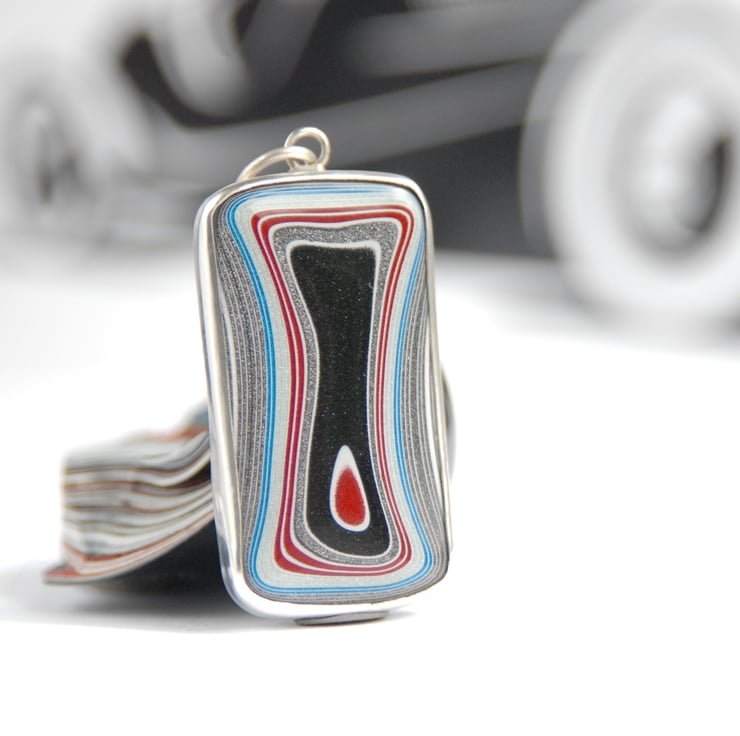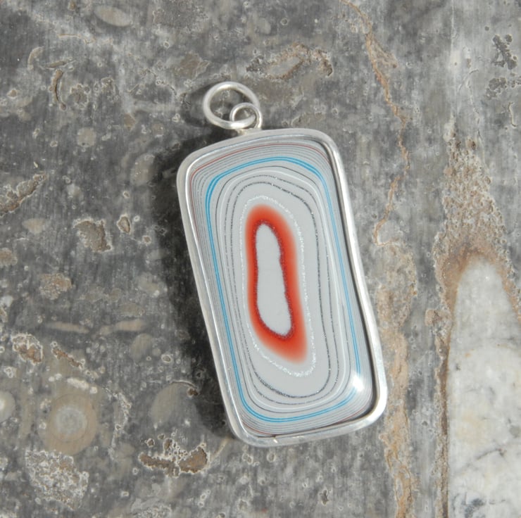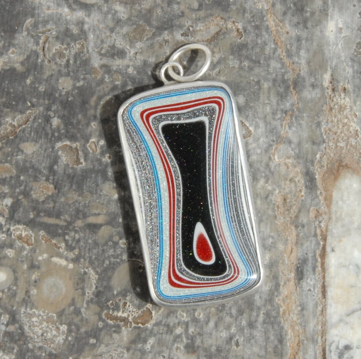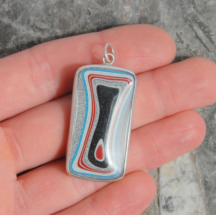 This oblong pendant has a super sparkly piece of fordite which has been bezel set in sterling silver and finished with a simple loop bail. The fordite has a pattern of concentric rings in shades of grey, silver, blue, black and red. The setting is open backed so you can see the very different pattern on the reverse, it is much more flat grey with fine rings of colour (the grey is primer). The colour palette is fairly unisex so this would suit anyone. The pendant measures approx 48mm (inc bail) by 19mm, it comes complete with an 18 inch silver chain but could easily be swapped onto a leather cord.