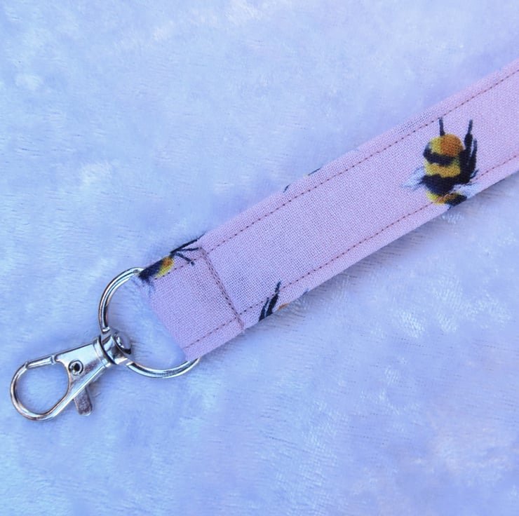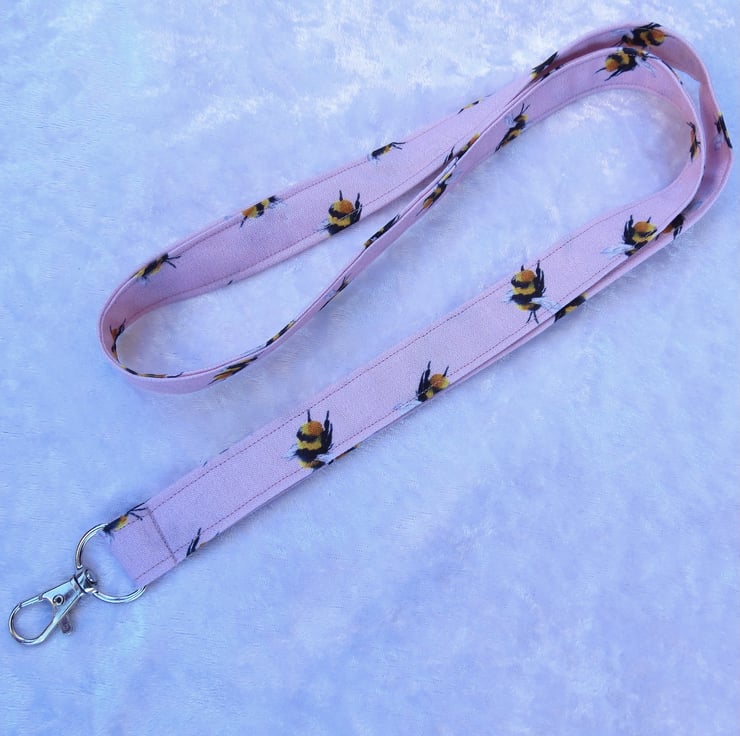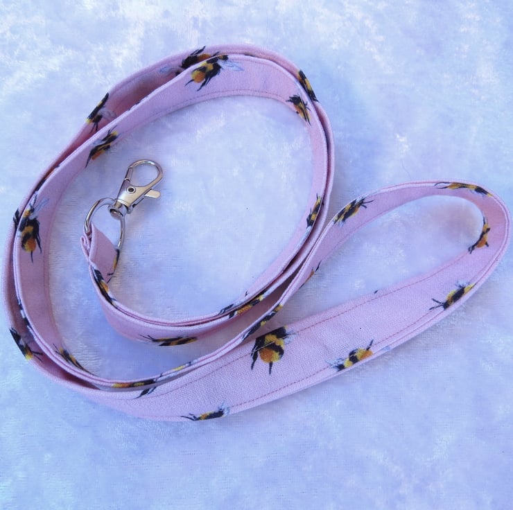 This Lanyard is made from a digitally printed cotton, with a bees design.