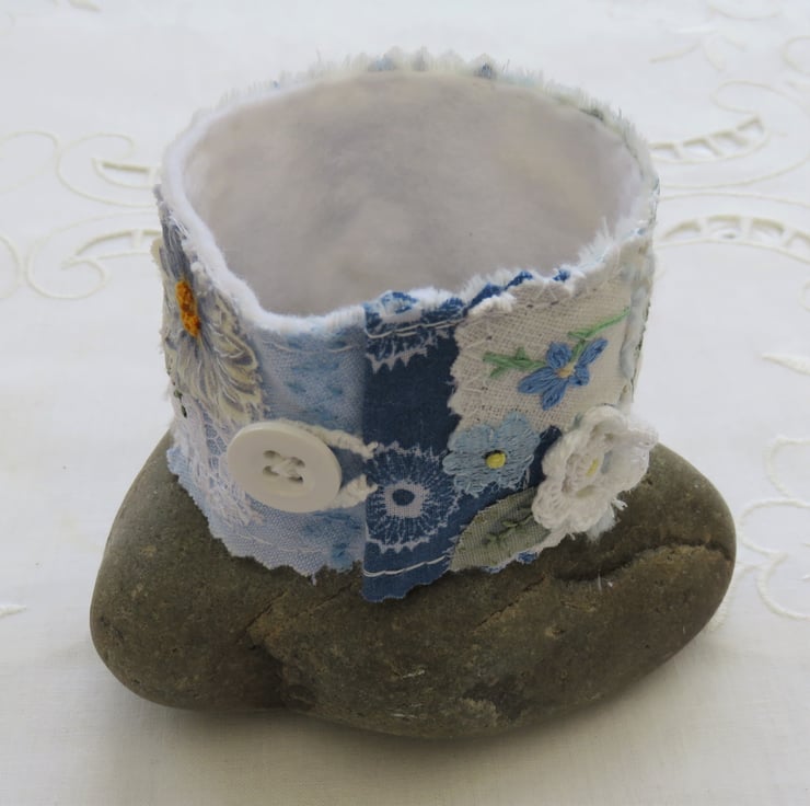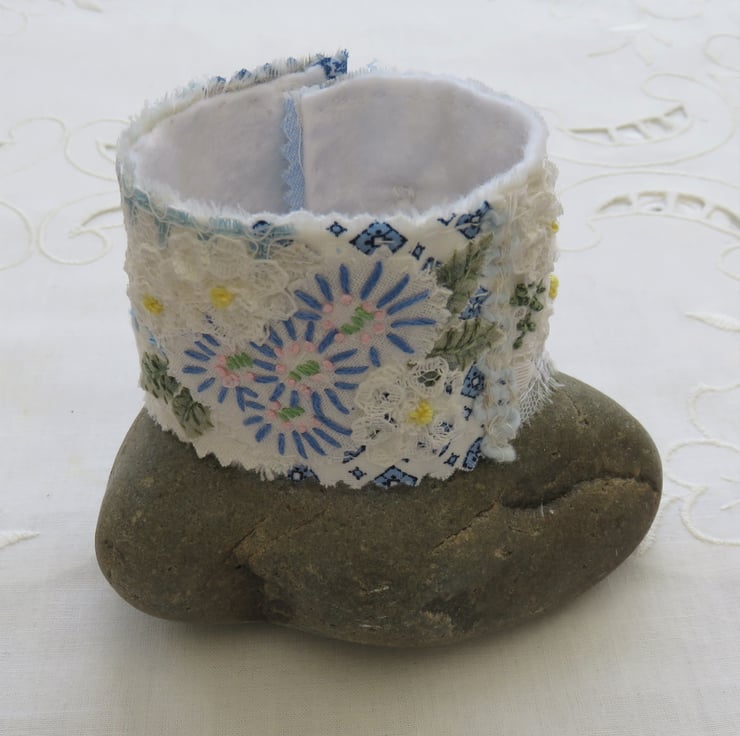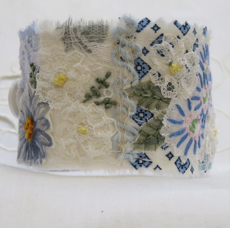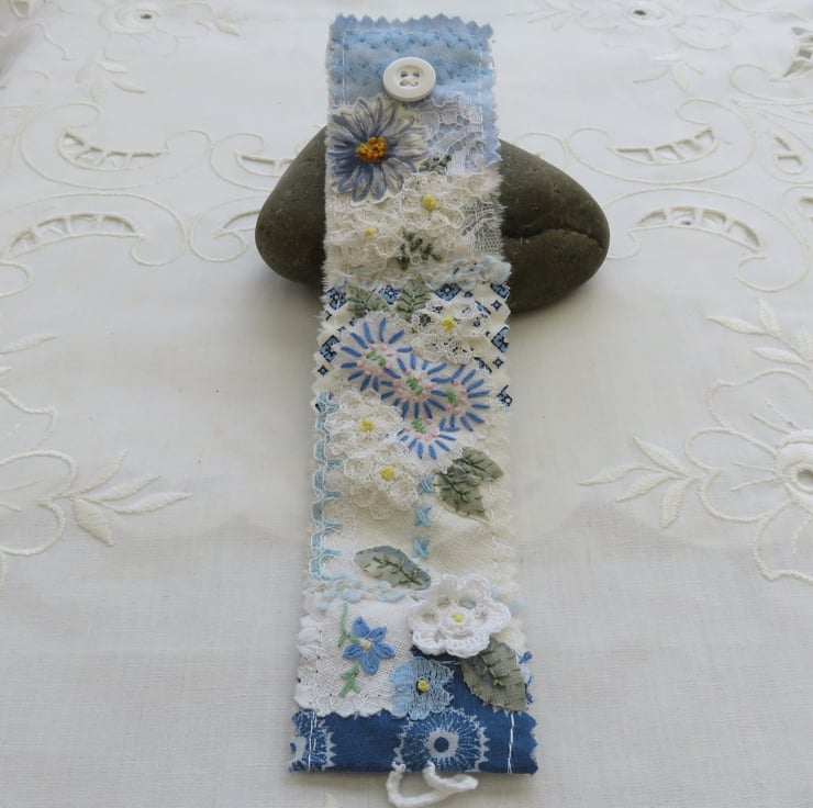 A lovely blue and white patchwork design featuring fragments of vintage embroidery combined with appliqued leaves and flowers and handmade lace rosettes and a tiny crocheted flower. This cuff is soft and comfortable to wear and easy to post as a gift!