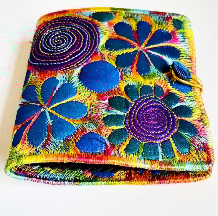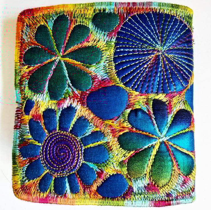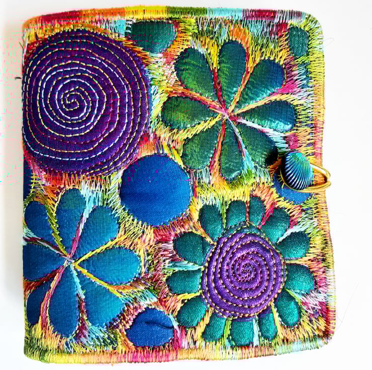 Made from layers of fabric including hand dyed Egyptian cotton and silk fabrics using the free machine embroidery style of sewing
