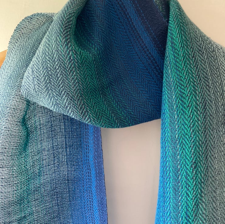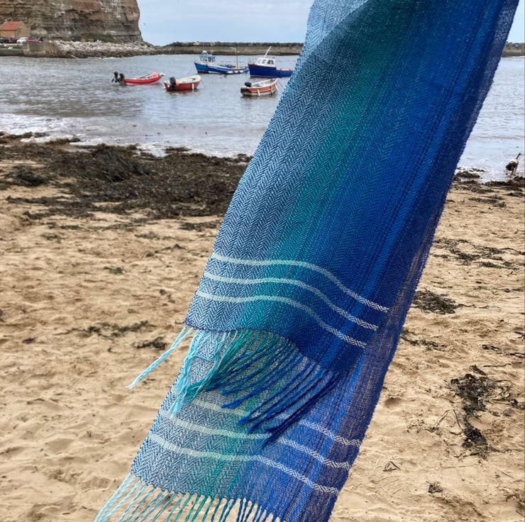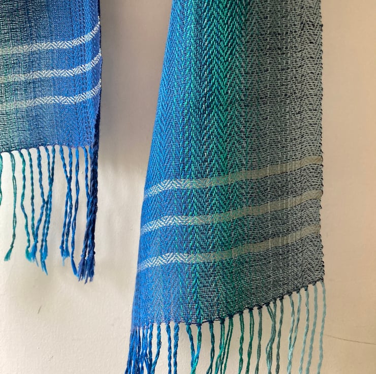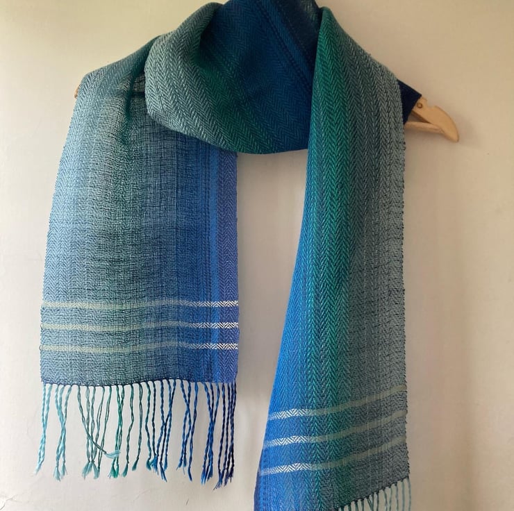 Handwoven in 6 shades of very fine cotton l in a Fibonacci gradient. Gently shifting from deep navy through turquoise and teal, to lighter shades of sea spray , the scarf plays with colour and light when wound around the neck creating dramatic shifts in light and dark. Woven in linen a classic herringbone, the scarf is embellished with pale gold silk weft at each end. Inspired by the play of light on the waves at Sands End, this is the perfect weight of scarf, and is great for people sensitive to wool and looking for a gossamer-light summer scarf. Linen and cotton is non itchy and naturally regulates temperature. Very light, with a good drape.
