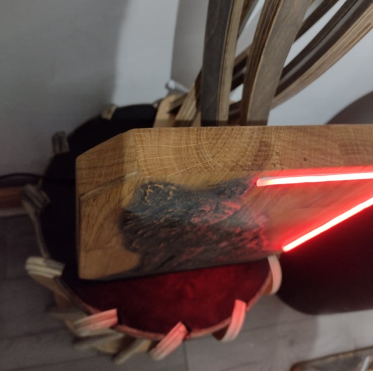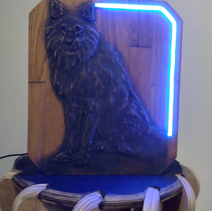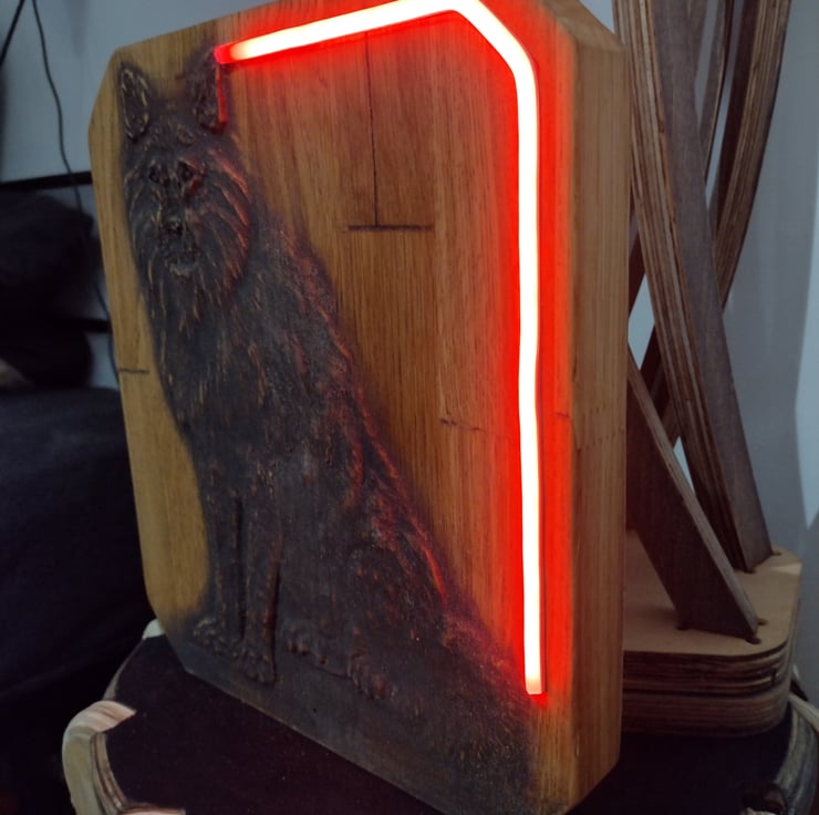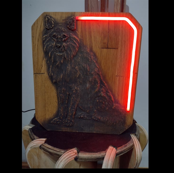 This solid oak timber wolf carving has an illuminating RGB LED neon bar built into it for ascent lighting and style, you can control the carvings brightness and colour using the remote provided.