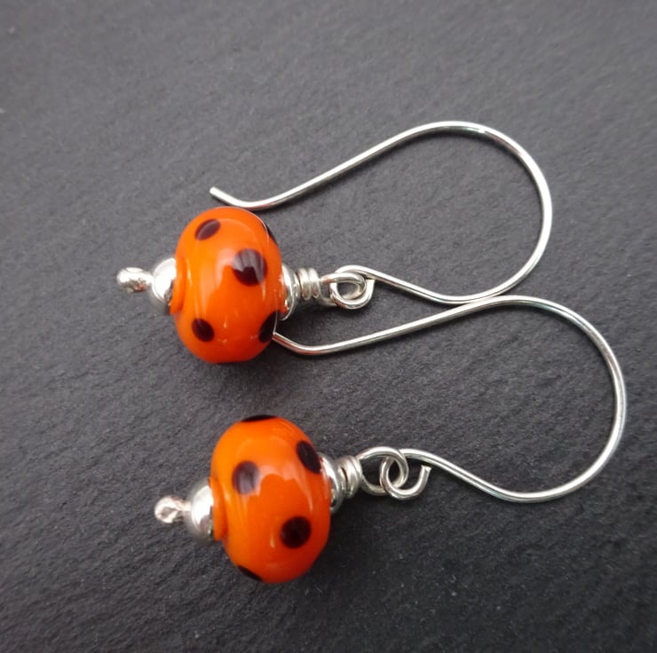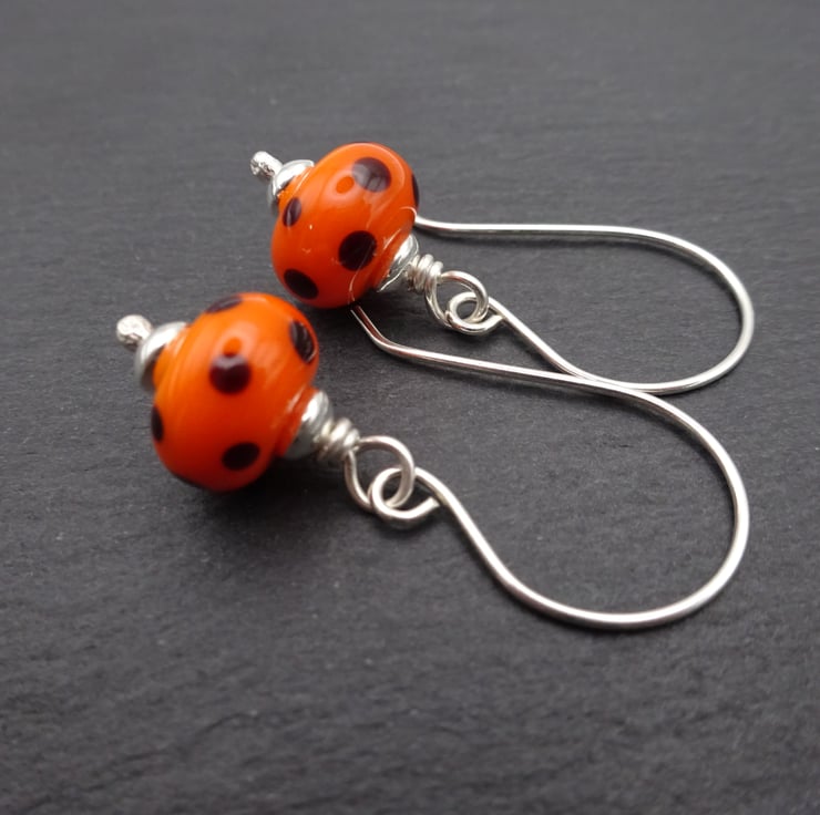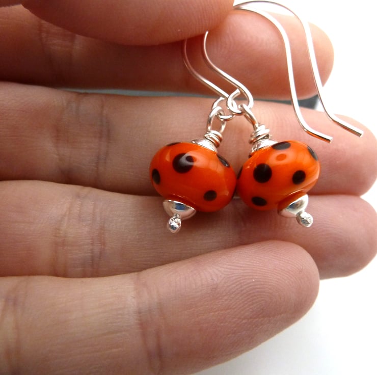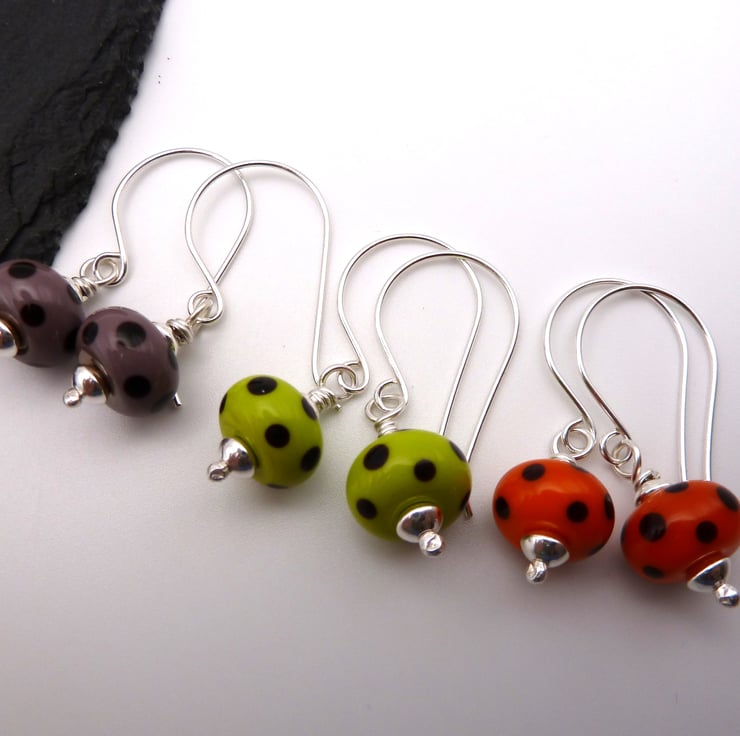 A pair of earrings made with handmade sterling silver ear wires, sterling silver beads and handmade lampwork glass beads.